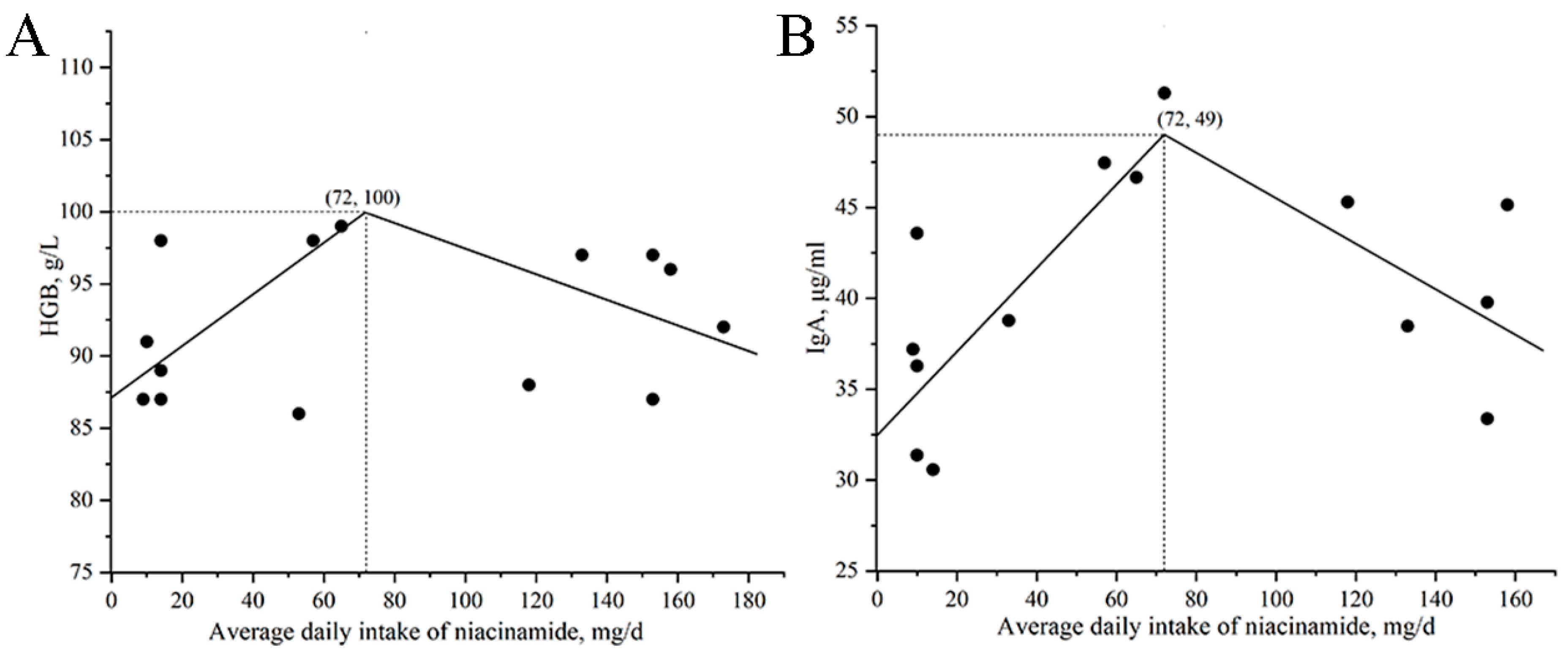 The relationship between daily niacinamide intake and both HGB and IgA is shown in Figure 4. The maximum HGB and IgA were observed at a daily intake of 72 mg, corresponding to an estimated dietary niacinamide concentration of 170 mg/kg.
