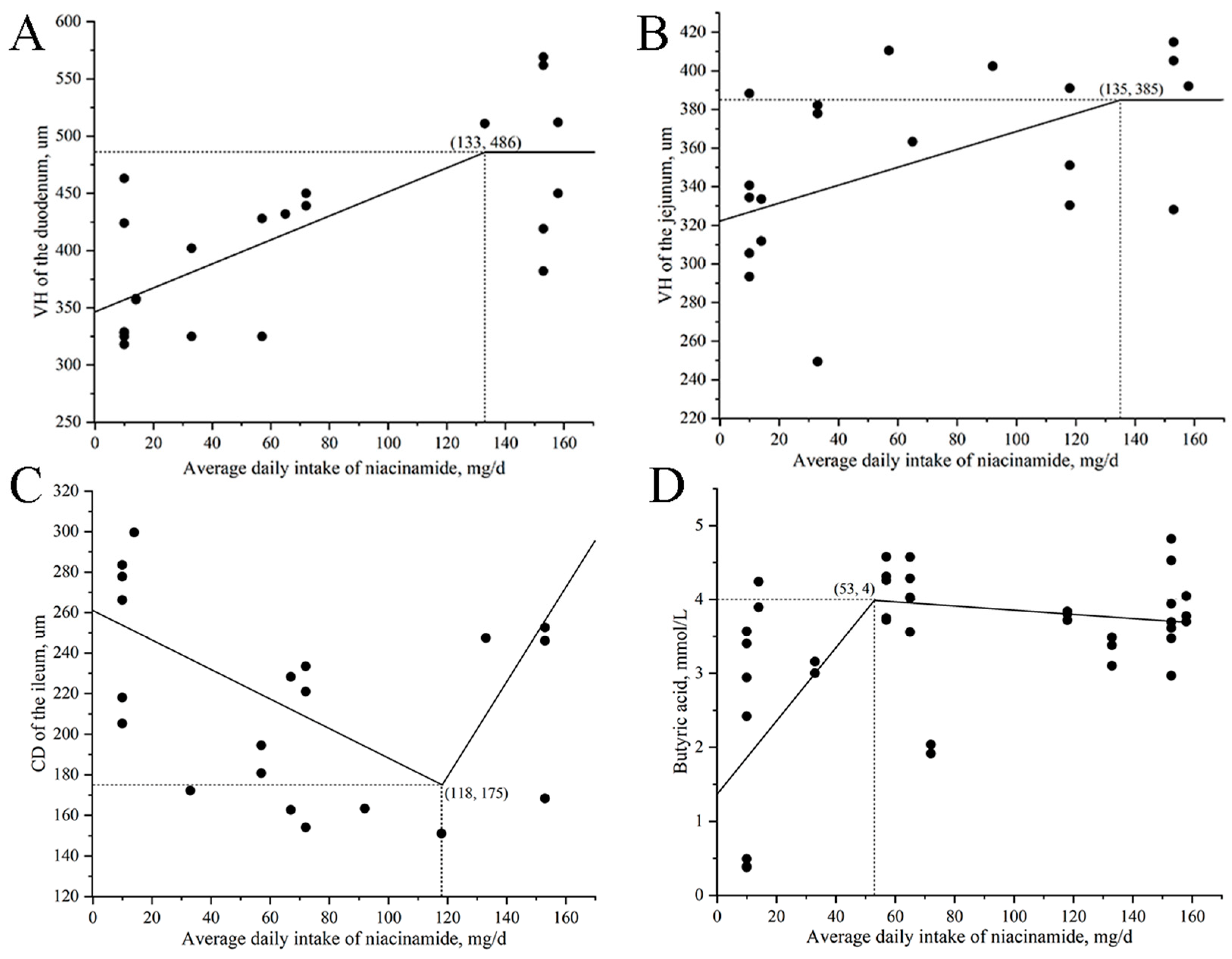 The relationship between daily niacinamide intake and VH of the duodenum and jejunum, as well as CD of the ileum, is shown in Figure 5A–C. The maximum VH of the duodenum and jejunum was observed at daily intakes of 133 mg and 135 mg, respectively, corresponding to an estimated dietary concentration of approximately 315 mg/kg niacinamide. The minimum CD of the ileum was observed at a daily intake of 118 mg, corresponding to approximately 280 mg/kg niacinamide.