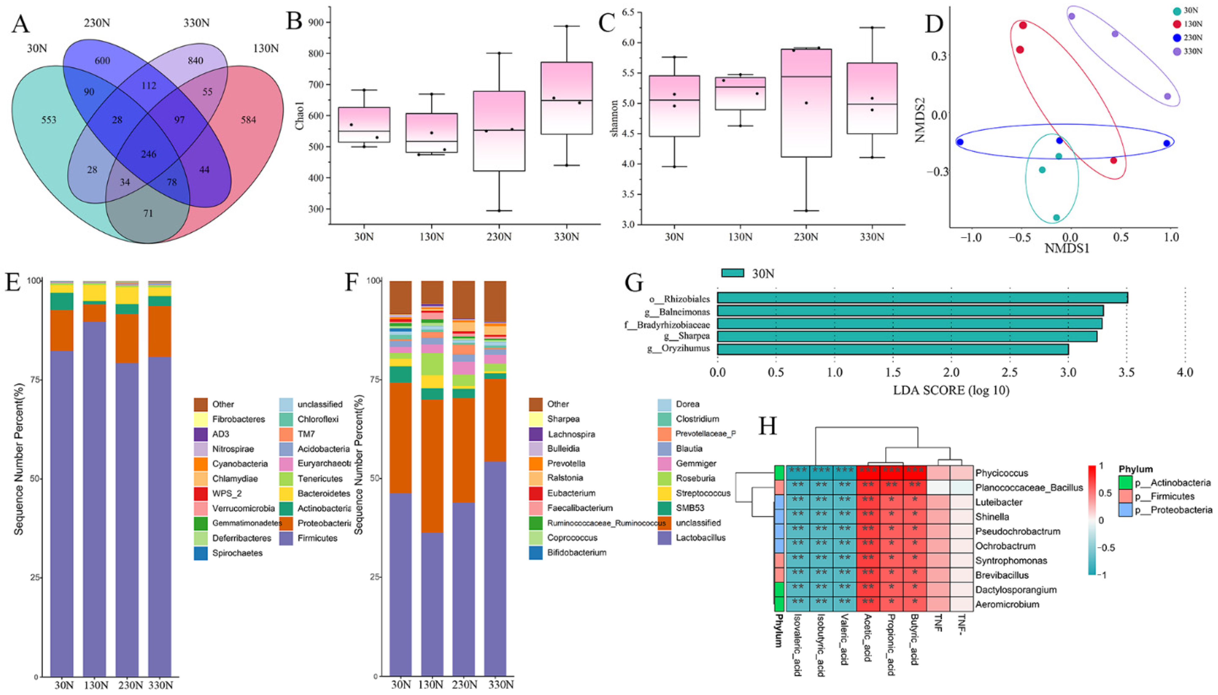 The colonic contents of the four groups detected 1128, 1209, 1295, and 1440 ASVs, respectively. The four groups shared 246 ASVs, whereas unique ASVs were 553, 584, 600, and 840 for the 30N, 130N, 230N, and 330N groups, respectively (Figure 6A).