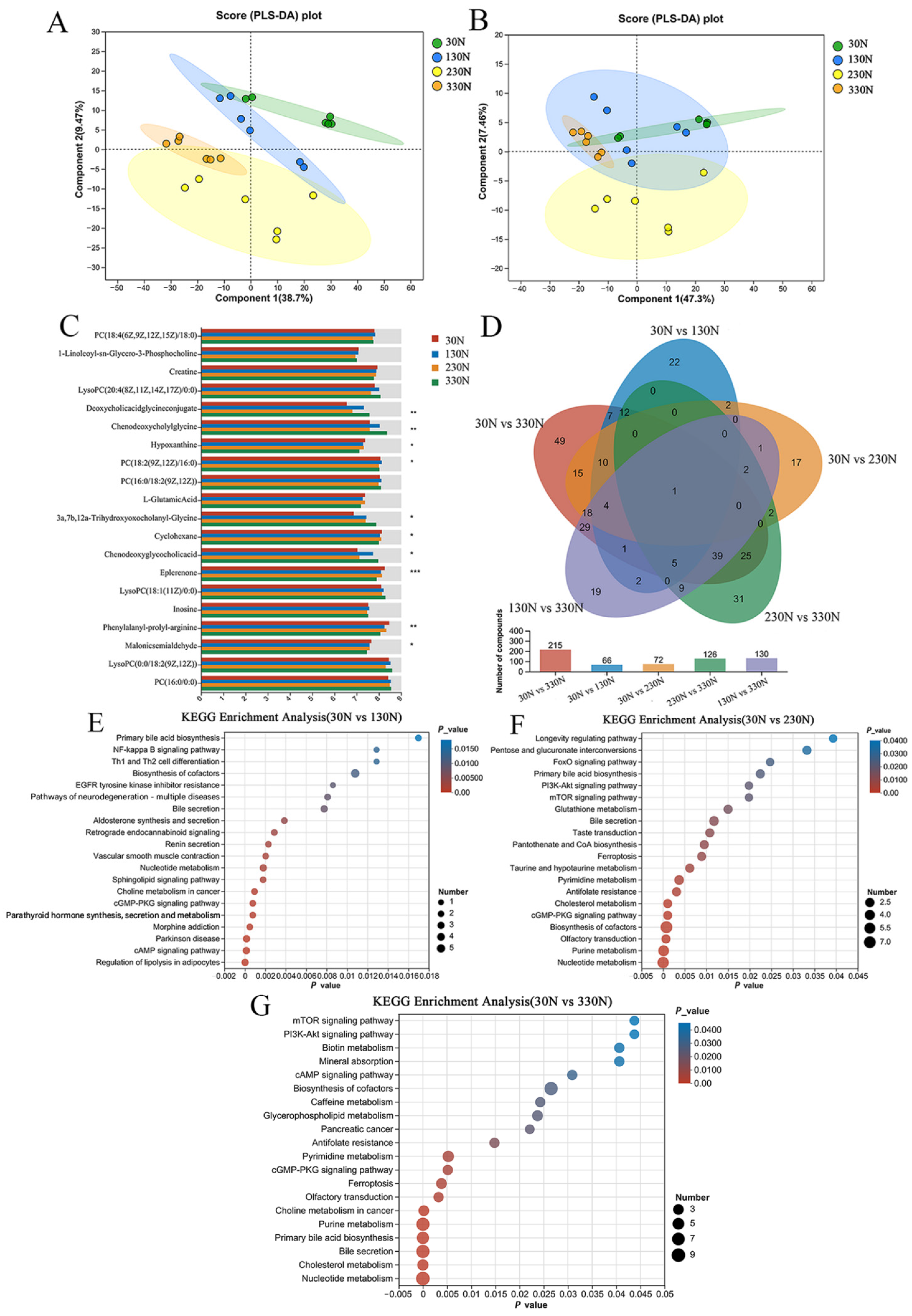 Differential metabolites were identified using univariate analysis based on fold change (FC) and Student’s t-test. Metabolites were considered significantly different if they met the criteria of FC > 1.5 and p < 0.05. As shown in Figure 7D, a total of 66, 72, and 215 differential metabolites were identified in the 30N group when compared to the 130N, 230N, and 330N groups, respectively. Additionally, 100 differential metabolites were identified between the 130N and 330N groups, and 126 between the 230N and 330N groups.