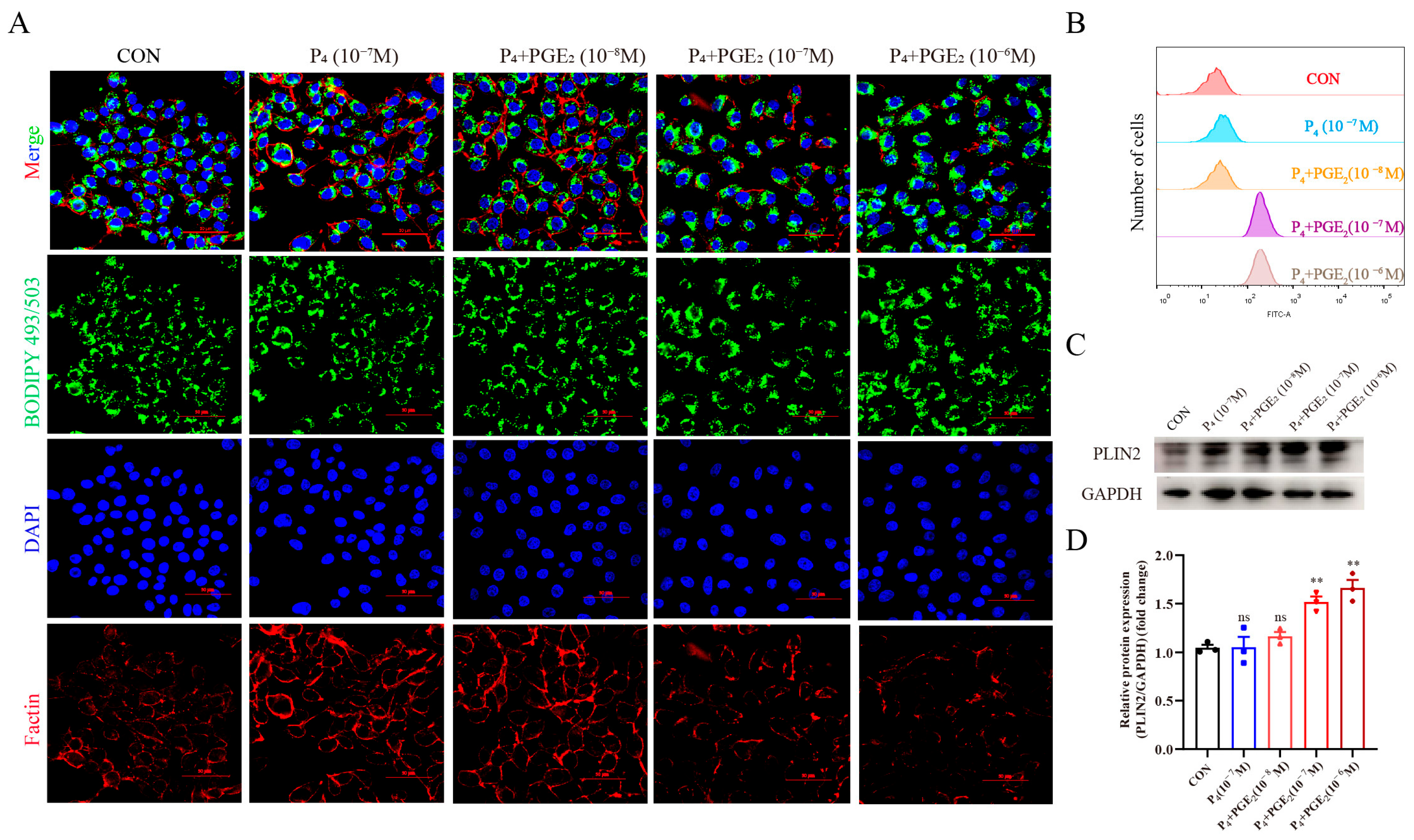 3.1. PGE2 Treatment Induces Lipid Droplet Accumulation and Alternation of Cell Morphology in Bovine Endometrial Epithelial Cells