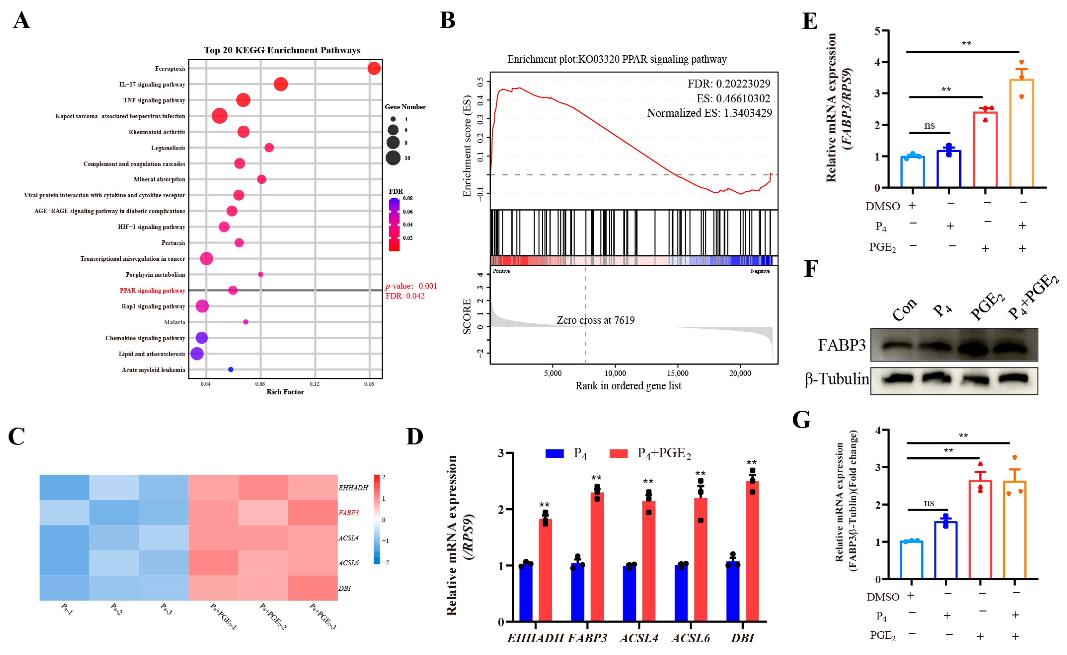 Zhang B, Yan Y, Cheng M, Guo T, Gao K, Wang A, Lin P, Zhou D, Jin Y. FABP3 Mediates Lipid Droplet Accumulation and Adhesive Capacity in Bovine Endometrial Epithelial Cells via PGE2/PTGER4/PPAR Axis. Animals. 2025; 15(23):3417. https://doi.org/10.3390/ani15233417