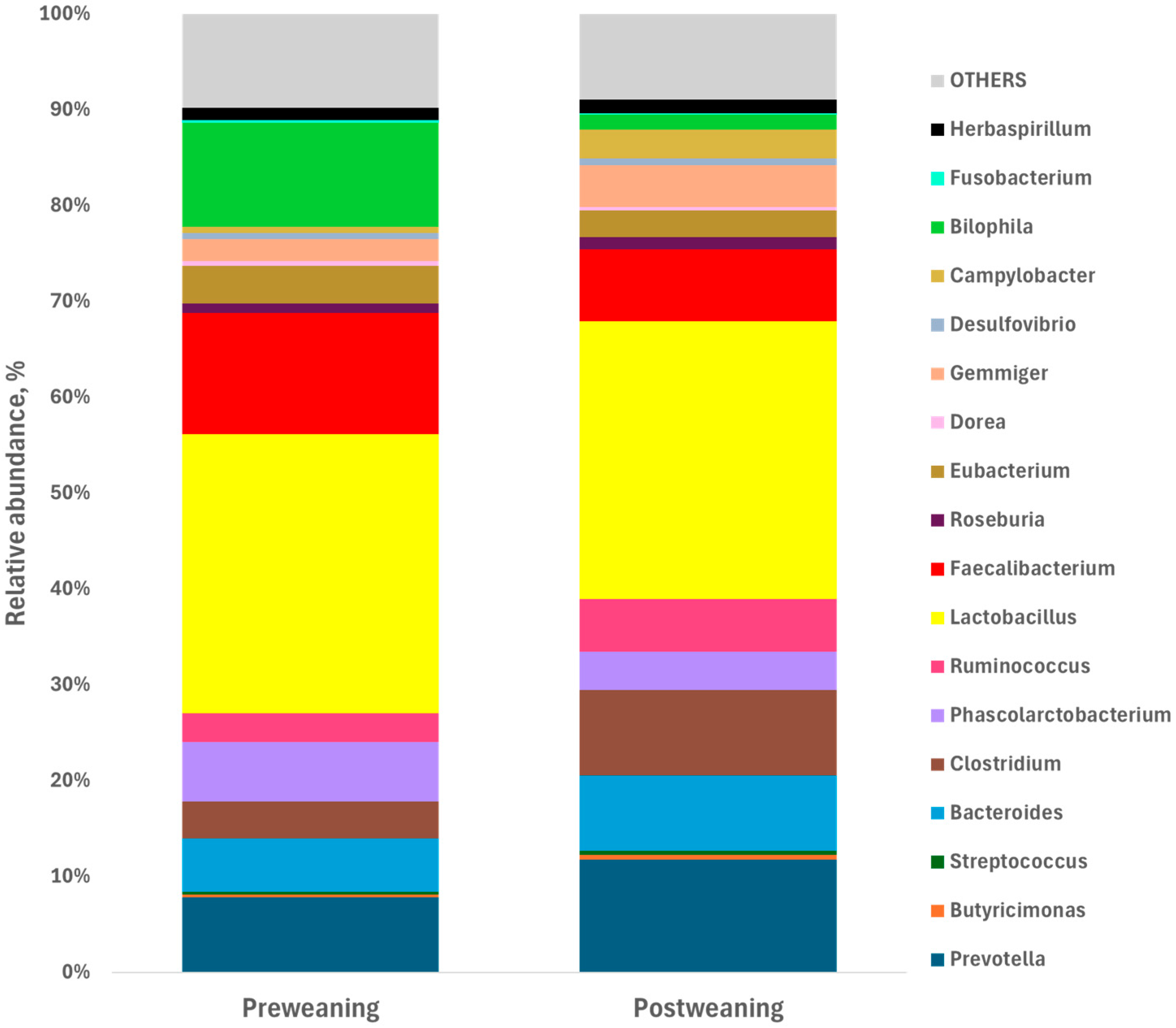 Table 4. Differences in bacterial species between pre-weaning and post-weaning periods. Values represent the mean relative abundance of the most predominant bacterial species identified in fecal samples. Analyses were conducted at the species level, including taxa with ≥1% relative abundance in at least one group.