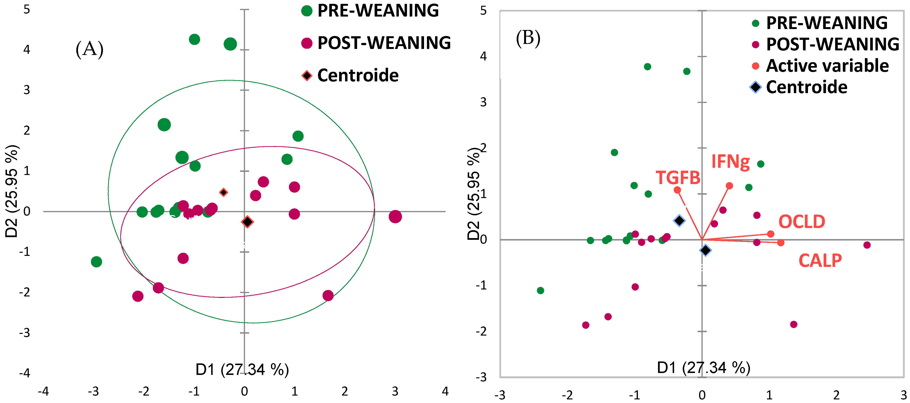 PCA of all intestinal integrity showed a clear separation between them, with IFN-γ and TGF-β clustering in the pre-weaning zone on the one hand and calprotectin and occludin towards the post-weaning zone on the other, with two principal components explaining 27.34% of the variation in Figure 2.
