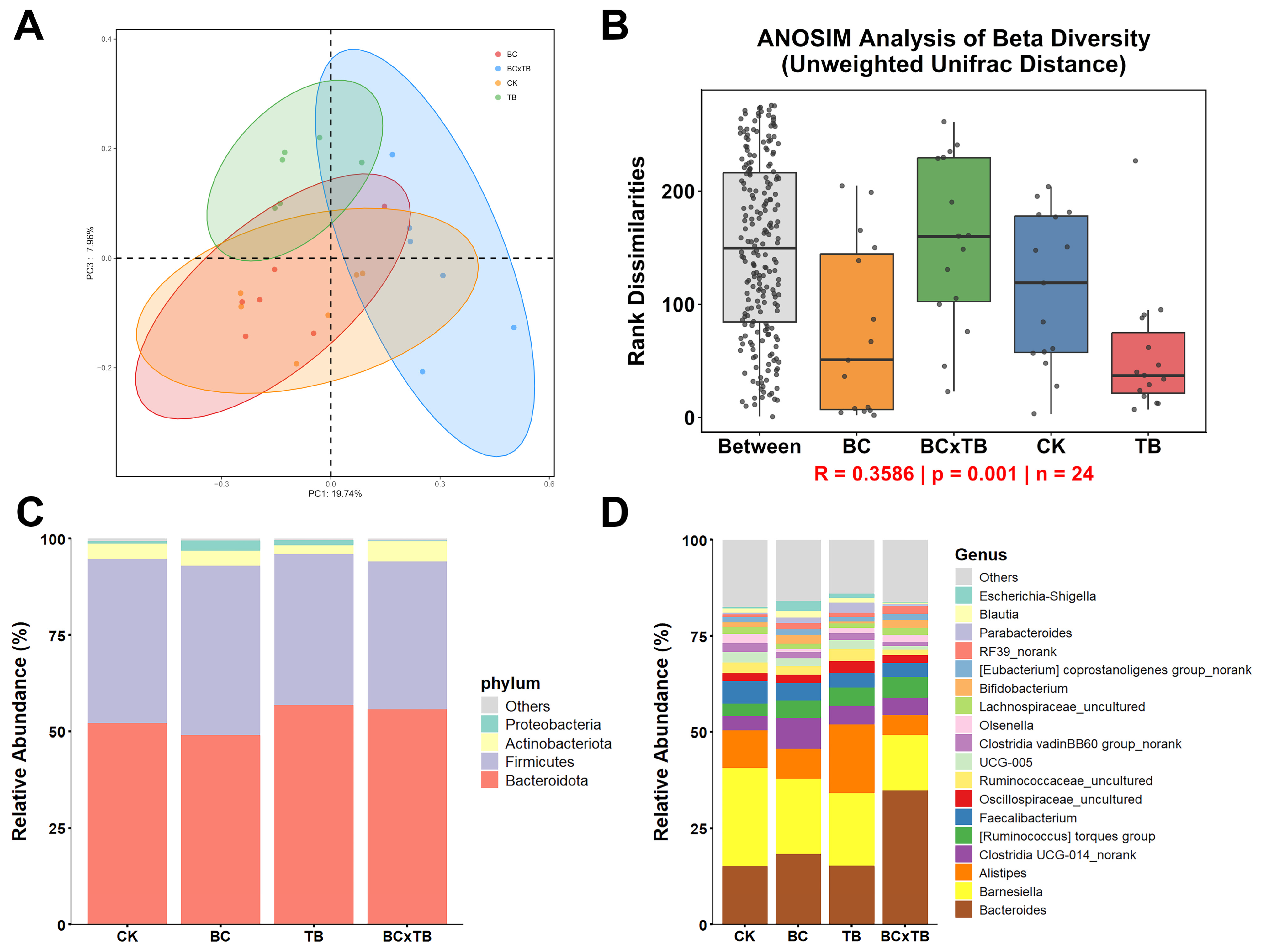 44]. These findings are consistent with the present study, in which individual or combined supplementation with BC or TB generally shifted the microbial community toward a more beneficial composition. Specifically, all treatment groups reduced the abundance of