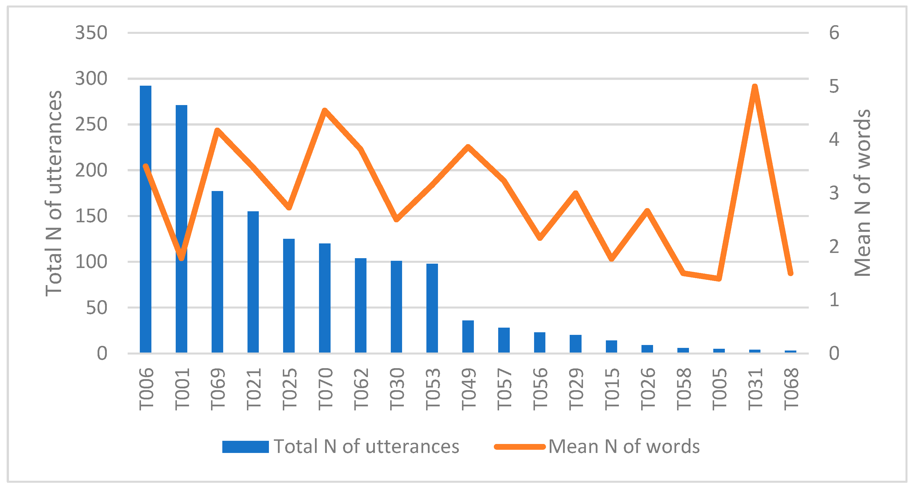 - Rice, M.L.; Smolik, F.; Perpich, D.; Thompson, T.; Rytting, N.; Blossom, M. Mean length of utterance levels in 6-month intervals for children 3 to 9 years with and without language impairments. J. Speech Lang. Hear. Res. 2010, 53, 333–349. [Google Scholar] [CrossRef] [PubMed]