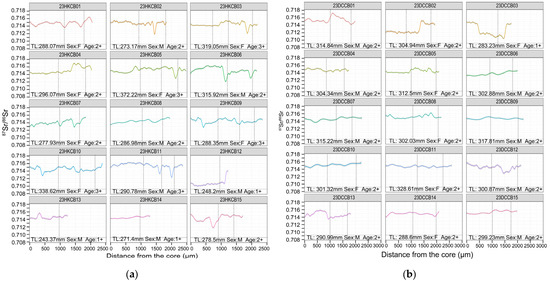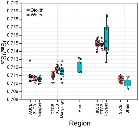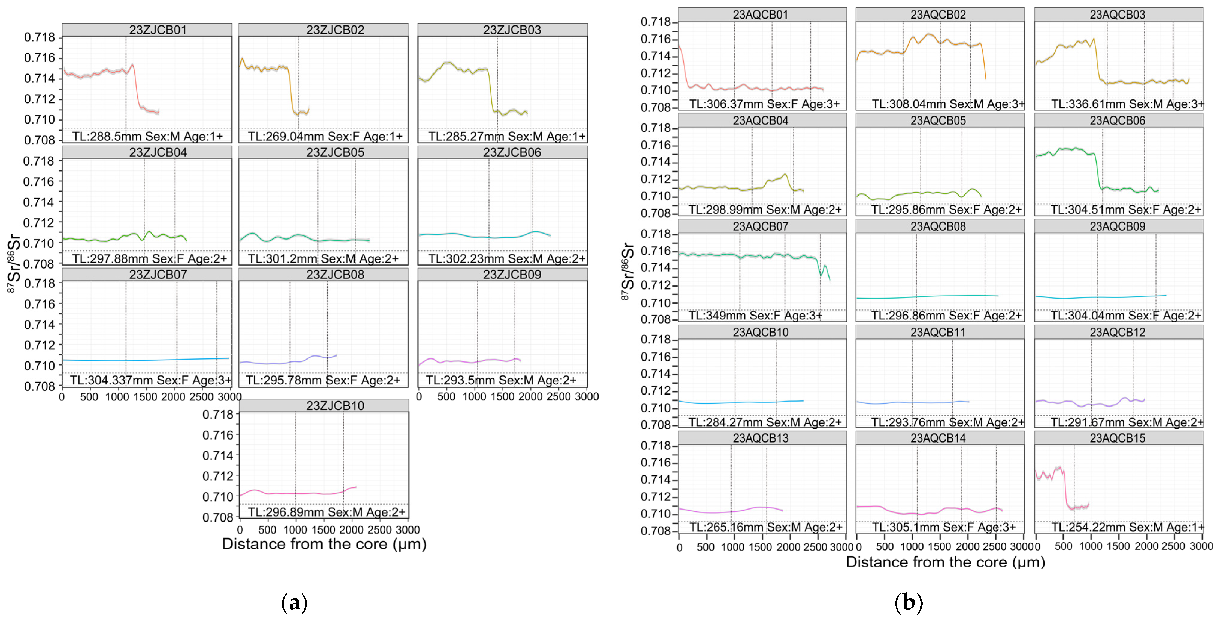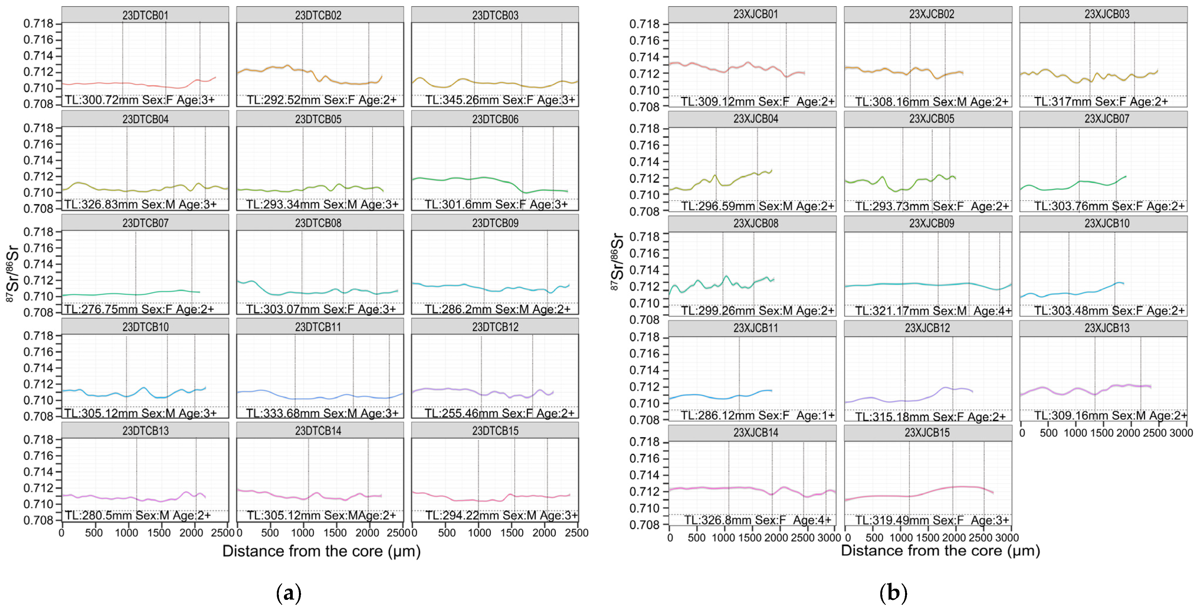 - Ohta, T.; Sueyoshi, M.; Shima, M.; Ida, S.; Iizuka, T. Estimation of tributary–mainstem migration of freshwater fishes by Sr isotope analysis of otoliths. Ecol. Res. 2024, 40, 409–421. [Google Scholar] [CrossRef]