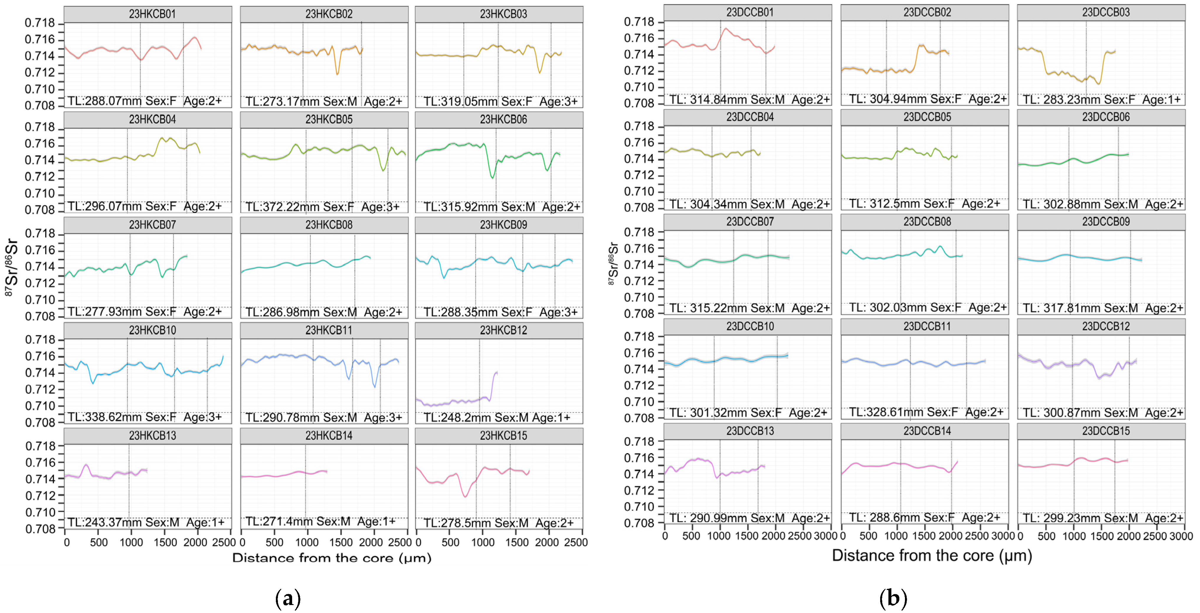 3.2. Otolith Edge 87Sr/86Sr and Recent Habitat Use