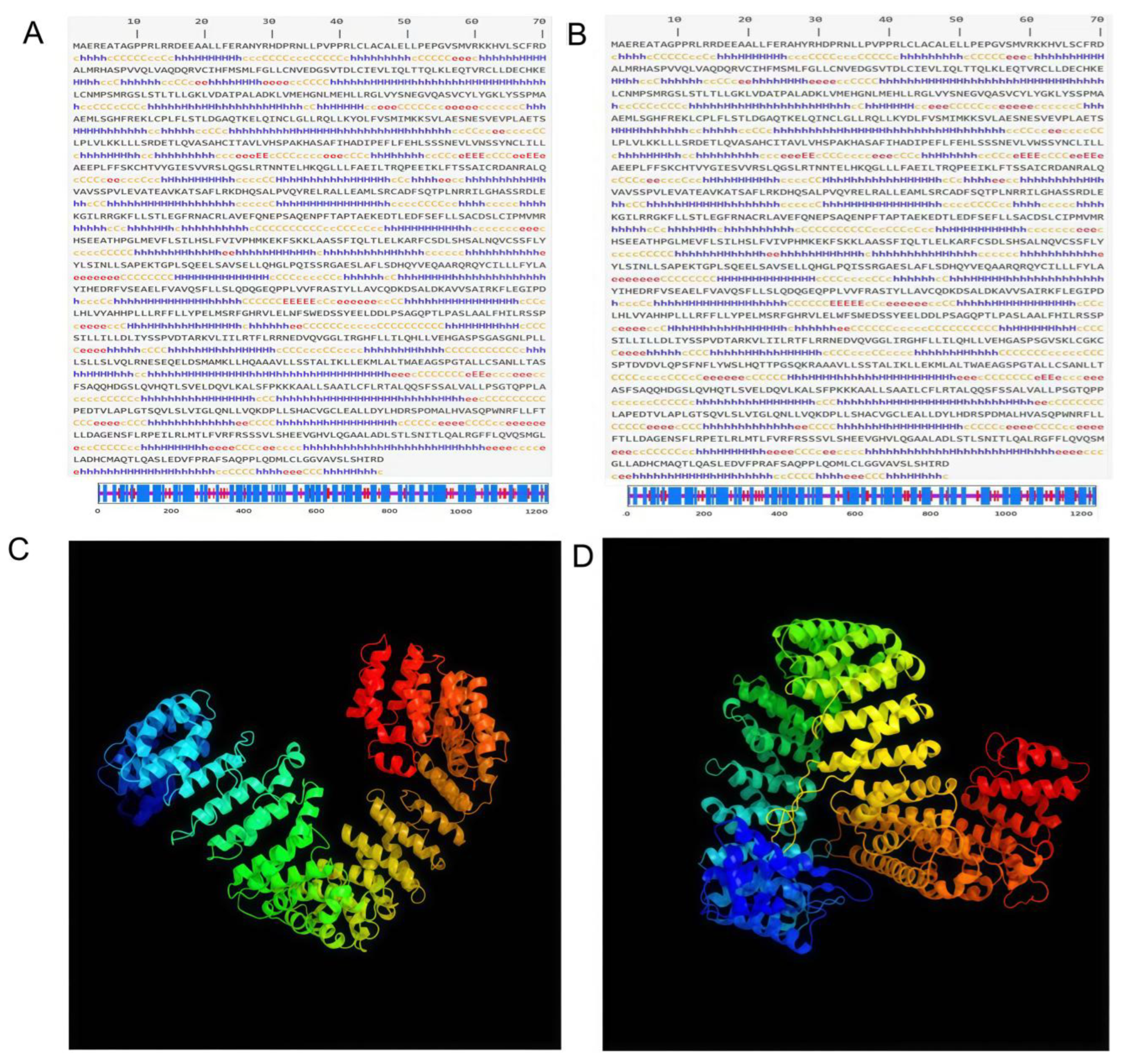 - Tertiary structures were modeled via the Phyre2 online server (http://www.sbg.bio.ic.ac.uk/phyre2, accessed on 24 November 2025).
