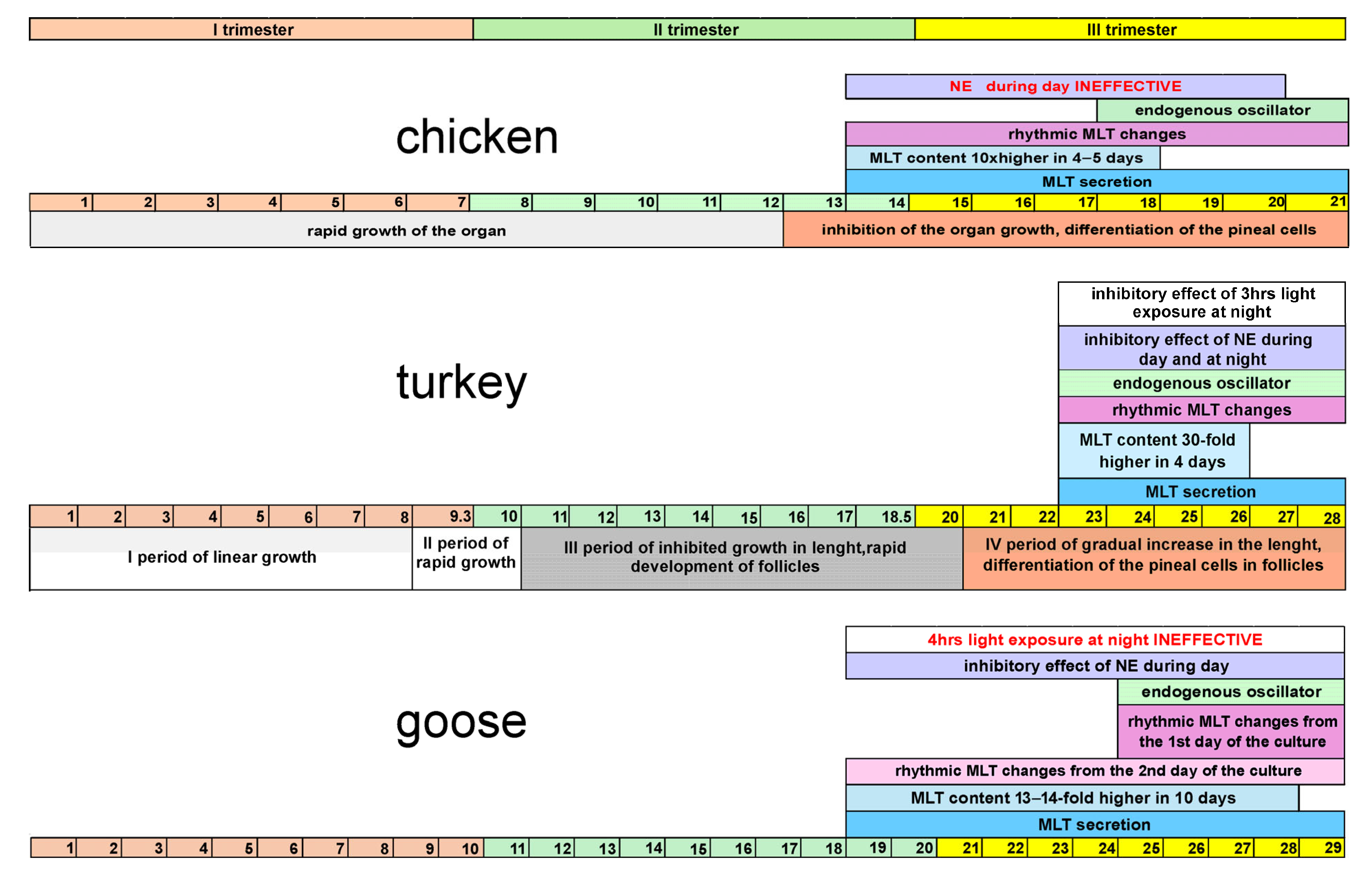 - Hanuszewska-Dominiak, M.; Martyniuk, K.; Lewczuk, B. Embryonic development of avian pineal secretory activity—A lesson from the goose pineal organs in superfusion culture. Molecules 2021, 26, 6329. [Google Scholar] [CrossRef] [PubMed]