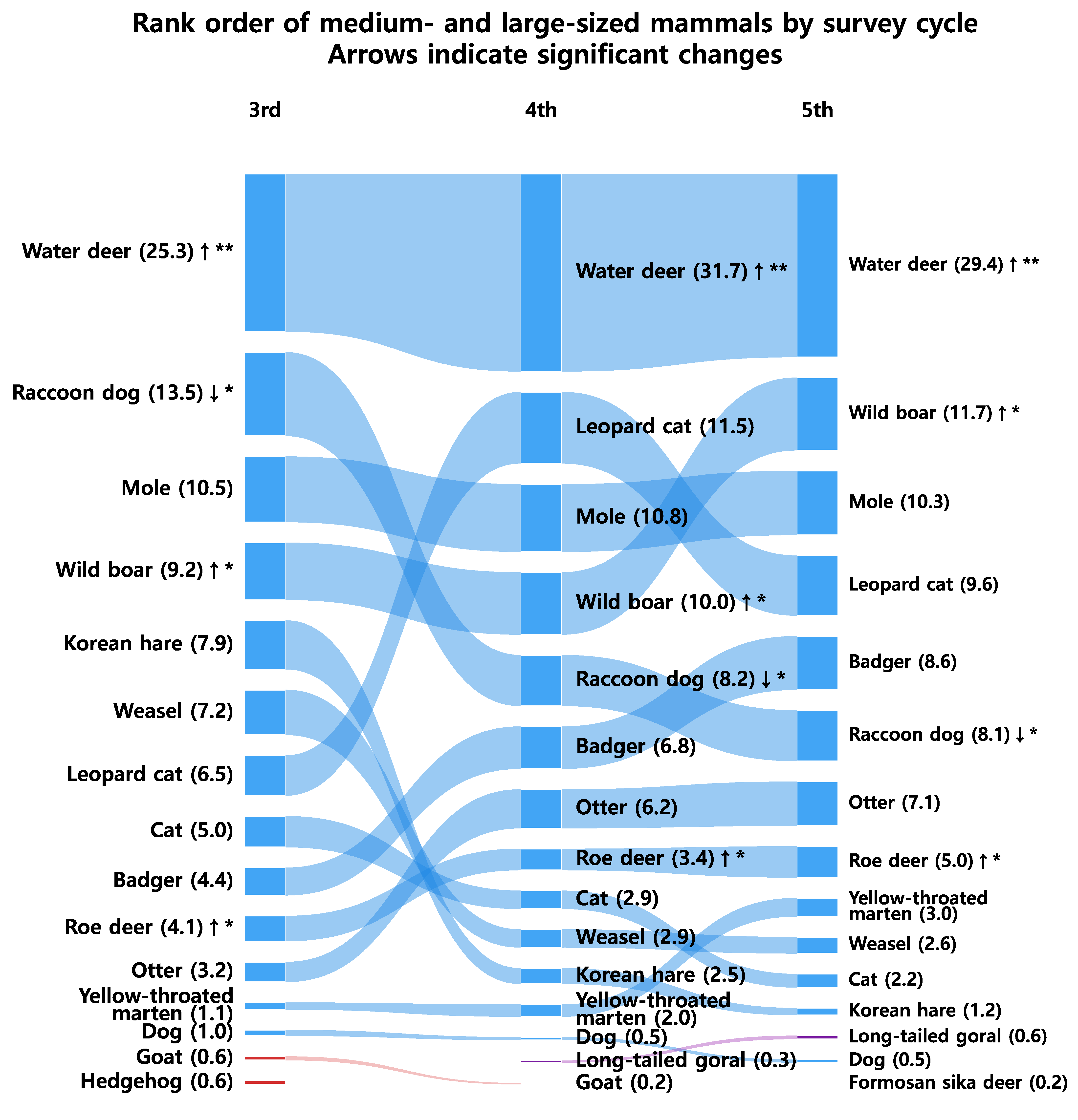 Yi, T.; Kim, T.G.; Lee, B.K.; Park, S.; Park, J.; Lee, J. Nationwide Temporal Dynamics of Mammal Communities Across South Korea: Dominance Shifts and Predator—Prey Implications. Animals 2025, 15, 3441. https://doi.org/10.3390/ani15233441
