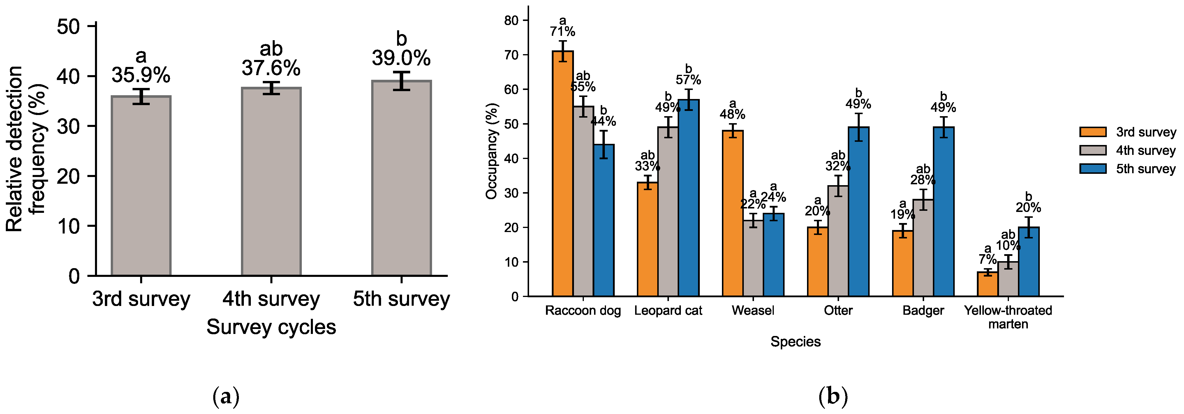 APA StyleYi, T., Kim, T. G., Lee, B. K., Park, S., Park, J., & Lee, J. (2025). Nationwide Temporal Dynamics of Mammal Communities Across South Korea: Dominance Shifts and Predator—Prey Implications. Animals, 15(23), 3441. https://doi.org/10.3390/ani15233441