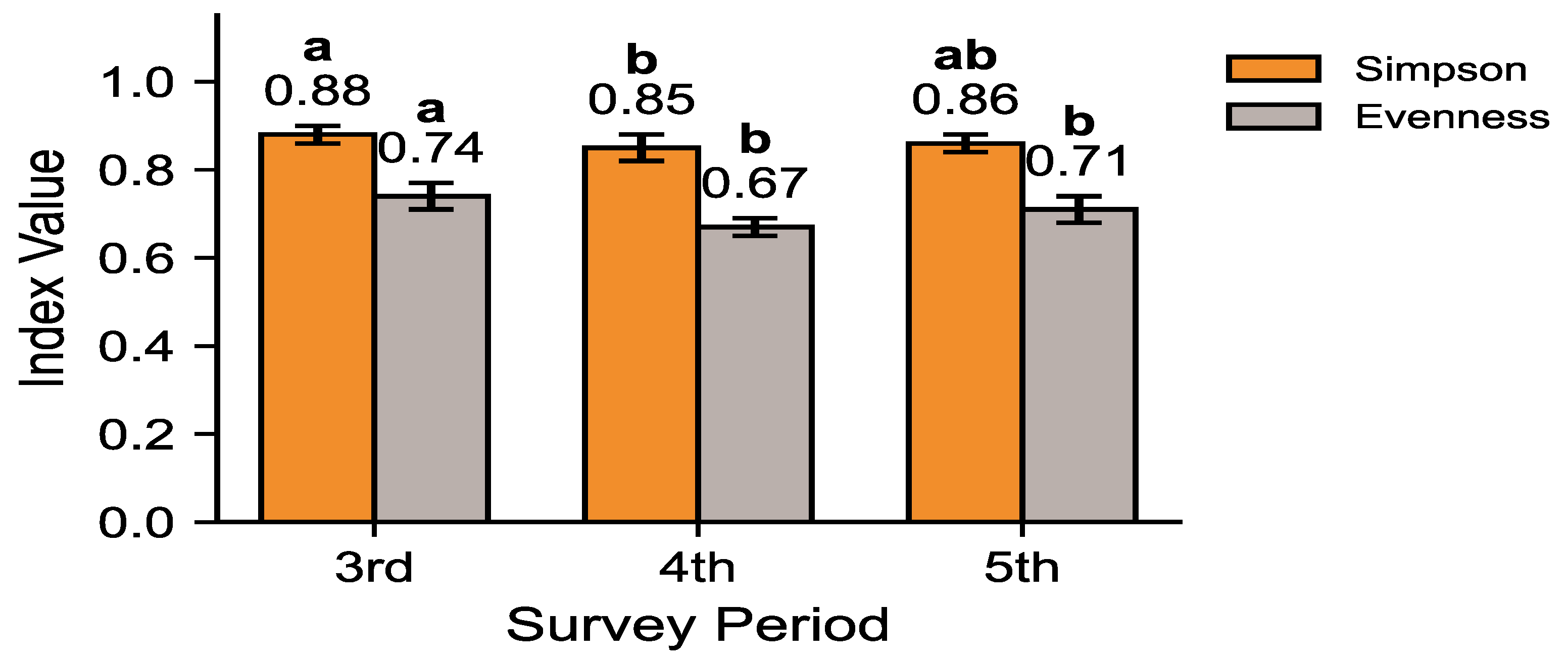 | Diversity indices | Kruskal–Wallis | H, p-value | H = 2.85, p = 0.245 | No significant difference among surveys |