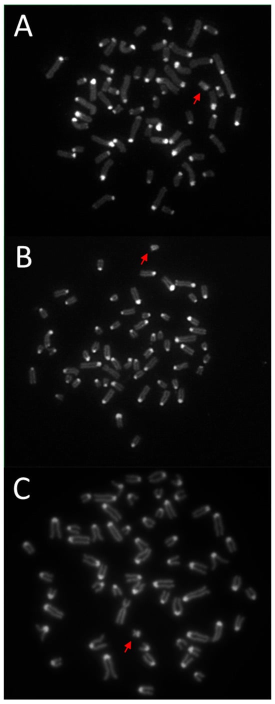 Results of the C-banding method with propidium iodide staining. Metaphase plates of: (A)—European bison (Bison bonasus), (B)—American bison (Bison bison), (C)—domestic cattle (Bos taurus). The Y chromosomes are marked with a red arrow. Magnification 100×.