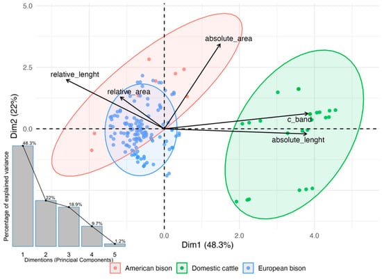 Principal component analysis (PCA) of Y chromosome morphometric traits and C-band heterochromatin content in domestic cattle (Bos taurus), American bison (Bison bison), and European bison (Bison bonasus). Black arrows represent variable loadings contributing to the first two principal components, which account for most of the total variance. Ellipses depict 95% confidence intervals around group centroids, showing clear separation among the three species. The inset scree plot illustrates the proportion of total variance explained by each principal component.