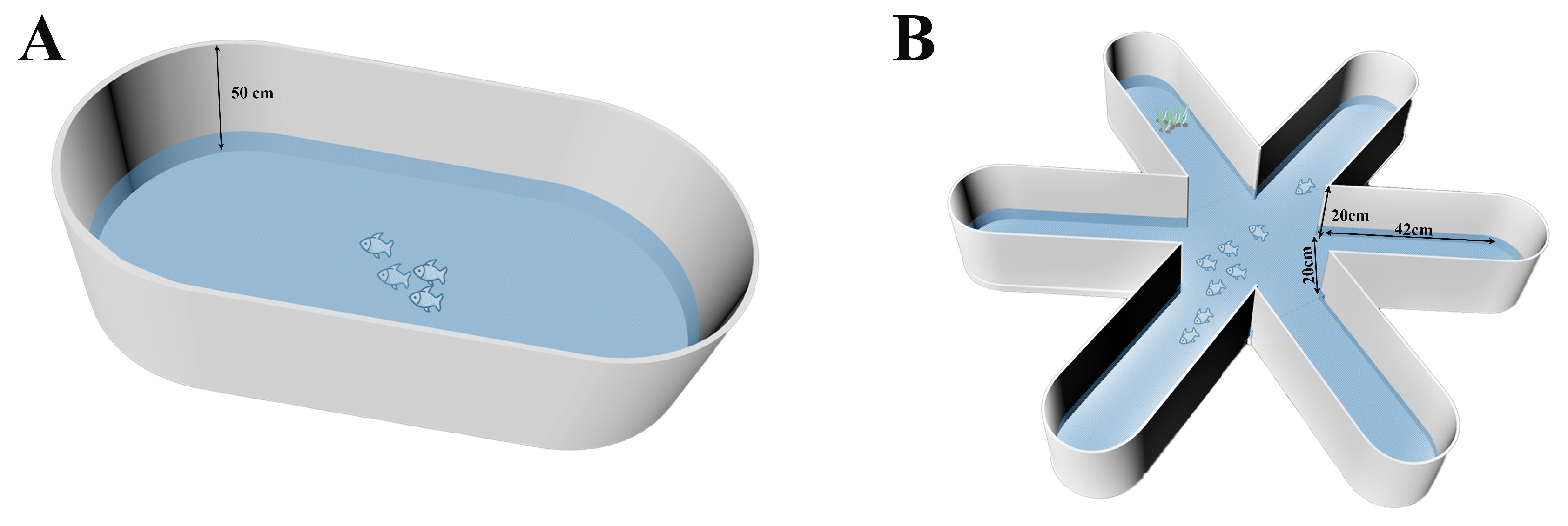 - Zhang, Y.; Zhou, W.; Fu, S.; Nadler, L.E.; Killen, S.S.; Zhou, K.-Y.; Zheng, S.-L.; Fu, C. Social Conditions Alter the Growth, Metabolic Rate, Behavioral Traits, and Food-Shelter Preferences in the Juvenile Qingbo Spinibarbus sinensis. Behav. Ecol. Sociobiol. 2025, 79, 44. [Google Scholar] [CrossRef]
