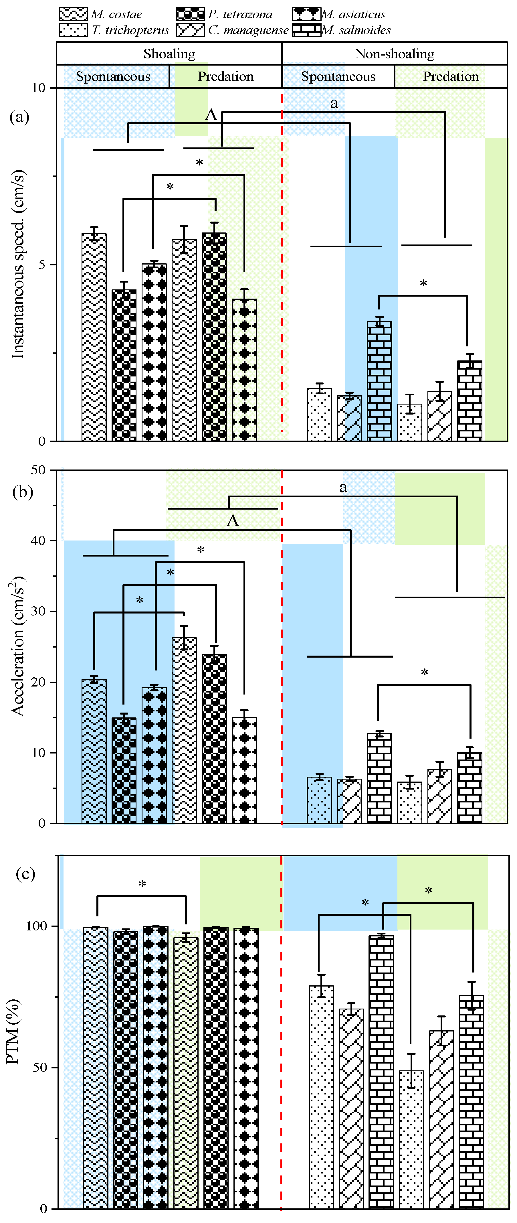 | Shoaling, S | F1,4.002 = 0.820 p = 0.416 | F1,3.994 = 0.794 p = 0.423 | F1,3.994 = 10.503 p = 0.032 * | F1,4.004 = 0.231 p = 0.656 |