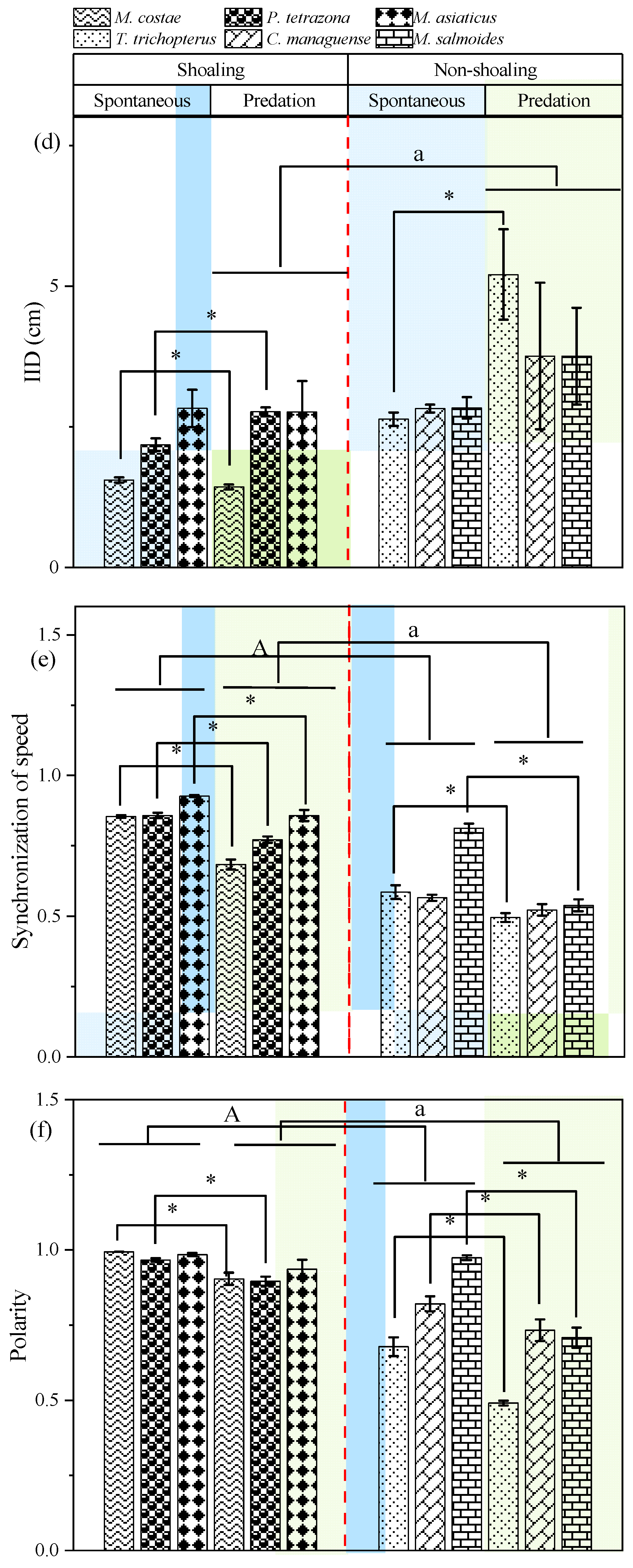 | Shoaling, S | F1,4 = 27.924 p = 0.006 * | F1,4 = 23.536 p = 0.008 * | F1,4 = 14.494 p = 0.019 * | F1,4 = 7.890 p = 0.048 * | F1,4 = 17.385 p = 0.014 * | F1,4 = 7.496 p = 0.052 |