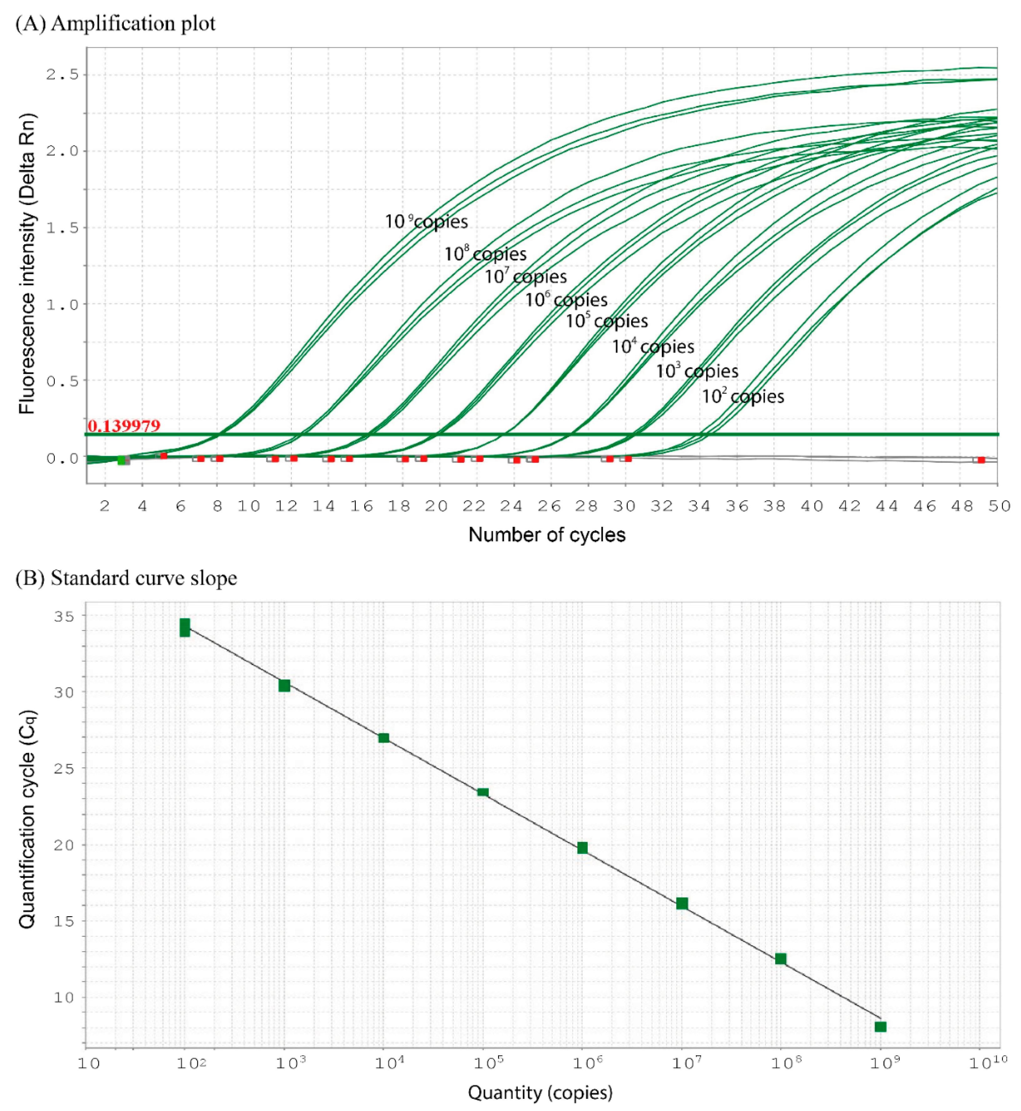 | Station | Quantification Cycle (Cq) Value | Total Volume Equivalent (Copies L−1) | Average | Standard Deviation | ||||