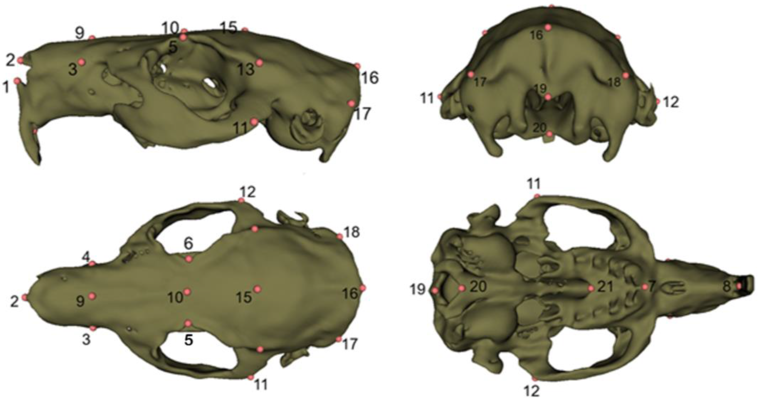 For morphometric analysis, a predefined set of 3D anatomical landmarks was placed on each skull model using the Markups (fiducial) tools within the SlicerMorph workflow in 3D Slicer, ensuring consistency across all specimens [