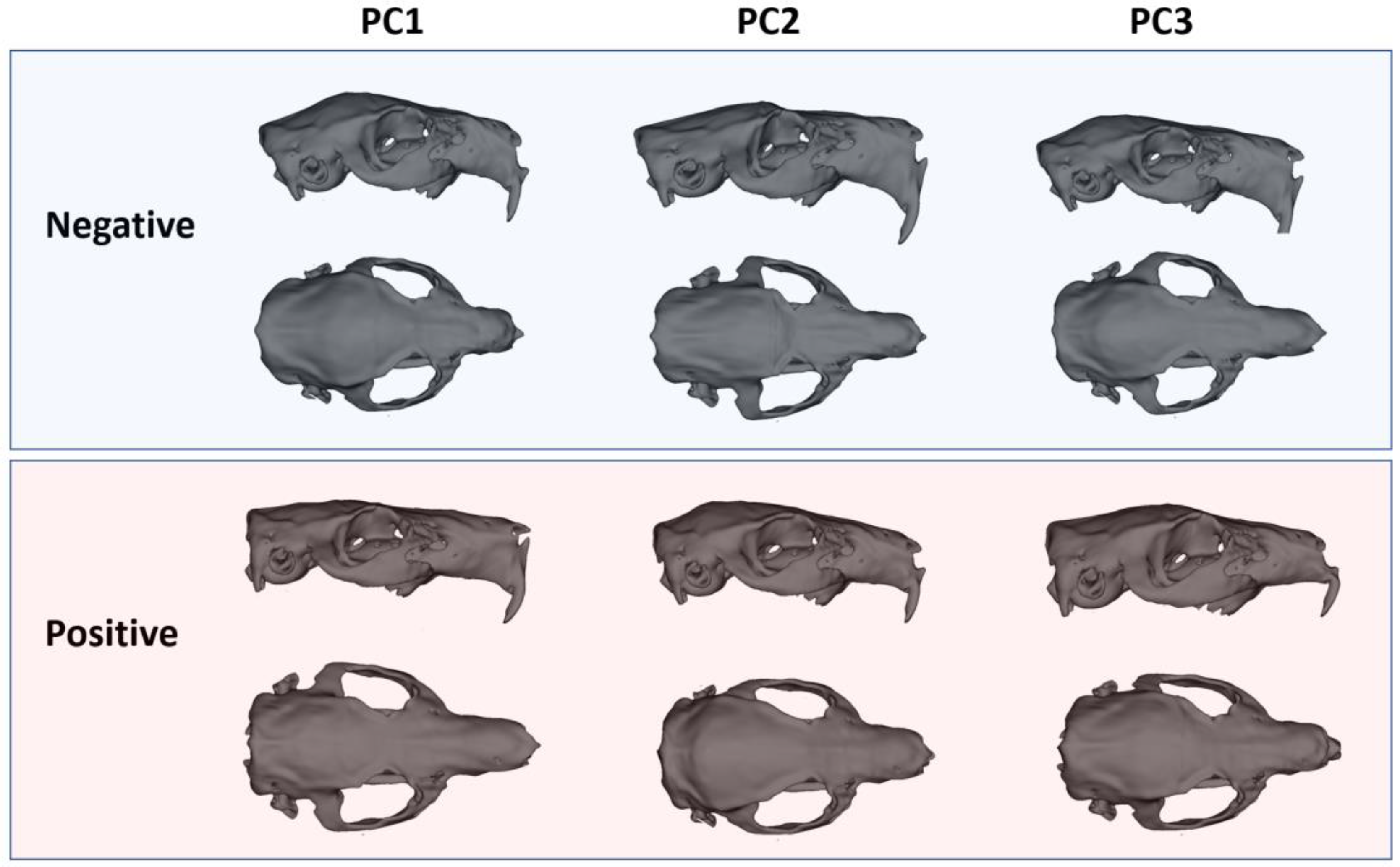 In comparison, PC2 (12.7%) captured variation related mainly to the dorsal cranial profile and orbital positioning, while PC3 (9.4%) reflected changes in the relative breadth of the rostrum and neurocranial proportions (