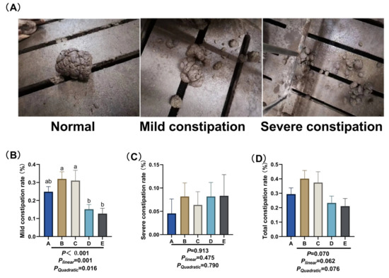 Effect of different dietary NDF intake during pregnancy on constipation in gestating gilts. (A) Constipation scoring criteria. Normal: Well-formed feces, soft and bulky, in columnar or banana-like shape; Mild constipation: Slightly hard feces, sized like table tennis balls, with a large main body accompanied by a small amount of small fecal pellets; Severe constipation: Dry and hard feces, small in particle size, mainly composed of small fecal pellets. (B) Mild constipation rates. (C) Severe constipation rates. (D) Total constipation rates. A: NDF levels = 19.28%; B: NDF levels = 21.36%; C: NDF levels = 22.08%; D: NDF levels = 22.67%; E: NDF levels = 23.43%. Differences in the superscript letters within different columns indicate that the difference is significant (p < 0.05).