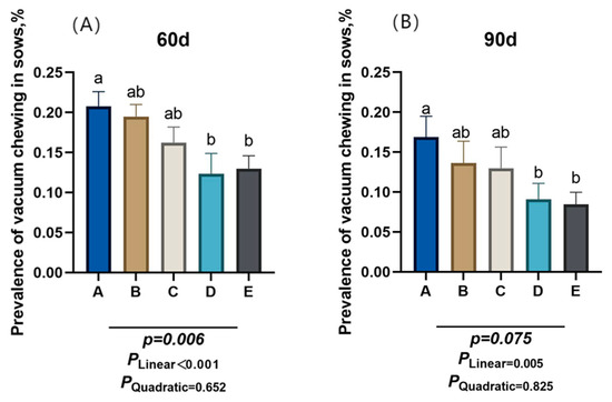 Effect of different dietary neutral detergent fiber intake on the prevalence of vacuum chewing in gestating gilts. (A) Day 60 of gestation. (B) Day 90 of gestation. A: NDF levels = 19.28%; B: NDF levels = 21.36%; C: NDF levels = 22.08%; D: NDF levels = 22.67%; E: NDF levels = 23.43%. Differences in the superscript letters within different columns indicate that the difference is significant (p < 0.05).