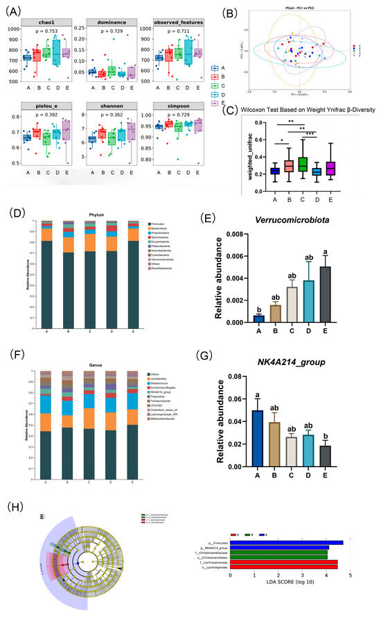 As shown in Figure 3D, the relative abundances of the top 10 bacterial taxa at both the phylum and genus levels are presented across different dietary NDF intake during gestation in gilts. The predominant phyla identified were Firmicutes, Bacteroidota, and Proteobacteria, collectively accounting for 89.63% to 94.85% of the total microbial composition across all groups. The remaining phyla, in descending order of proportion, are Spirochaetes, Euryarchaeota, Patescibacteria, Actinobacteria, Cyanobacteria, Verrucomicrobia, Desulfobacteria, and others. As shown in Figure 3E, at the phylum level, the relative abundance of Verrucomicrobia was increased significantly with increasing dietary NDF intake (p < 0.05). At the genus level (Figure 3F), Lactobacillus and Streptococcus were dominant. The remaining genera, in descending order of proportion, are Escherichia-Shigella, NK4A214_group, Treponema, Terrisporobacter, UCG-002, Clostridium_sensu_stricto_1, Lachnospiraceae_XPB1014_group, and Methanobrevibacter. As shown in Figure 3G, at the genus level, the relative abundance of NK4A214_group decreased linearly with increasing dietary NDF intake (Plinear < 0.05). From the LEfSe (Linear discriminant analysis Effect Size) analysis, the magnitude of the impact of the abundance of each component (species) in the treatment group on the differential effect can be determined; a longer bar indicates a more significant difference (Figure 3H). Specifically, the LDA score plot on the right (with an LDA threshold of 4) shows that group A enriched Firmicutes at the phylum level and NK4A214_group at the genus level, group B enriched Christensenellaceae at the family level and Christensenellales at the order level, and group E enriched Lachnospiraceae at the family level and Lachnospirales at the order level.