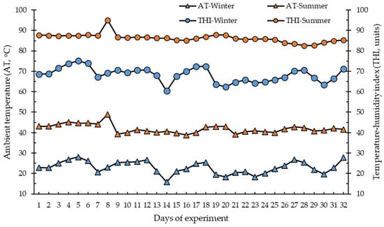 Daily averages of ambient temperature and temperature–humidity index during the winter (5 February to 8 March 2021) and summer (3 August to 3 September 2020) experimental periods.