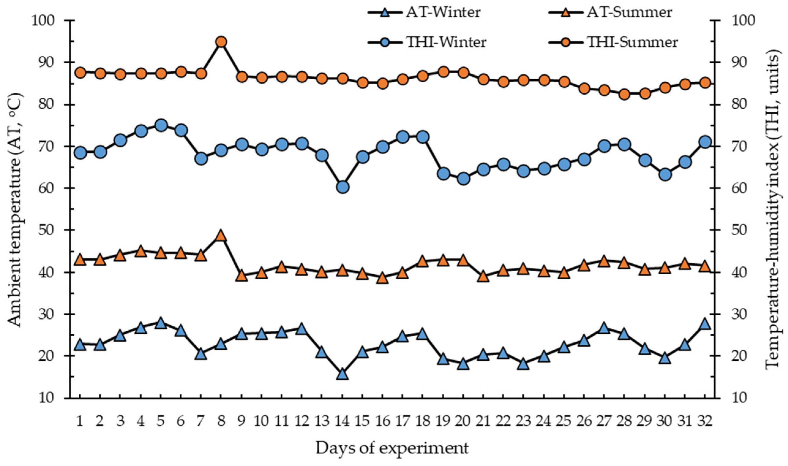 | Season | Ambient Temperature (◦C) | Relative Humidity (%) | THI (Units) | ||||||