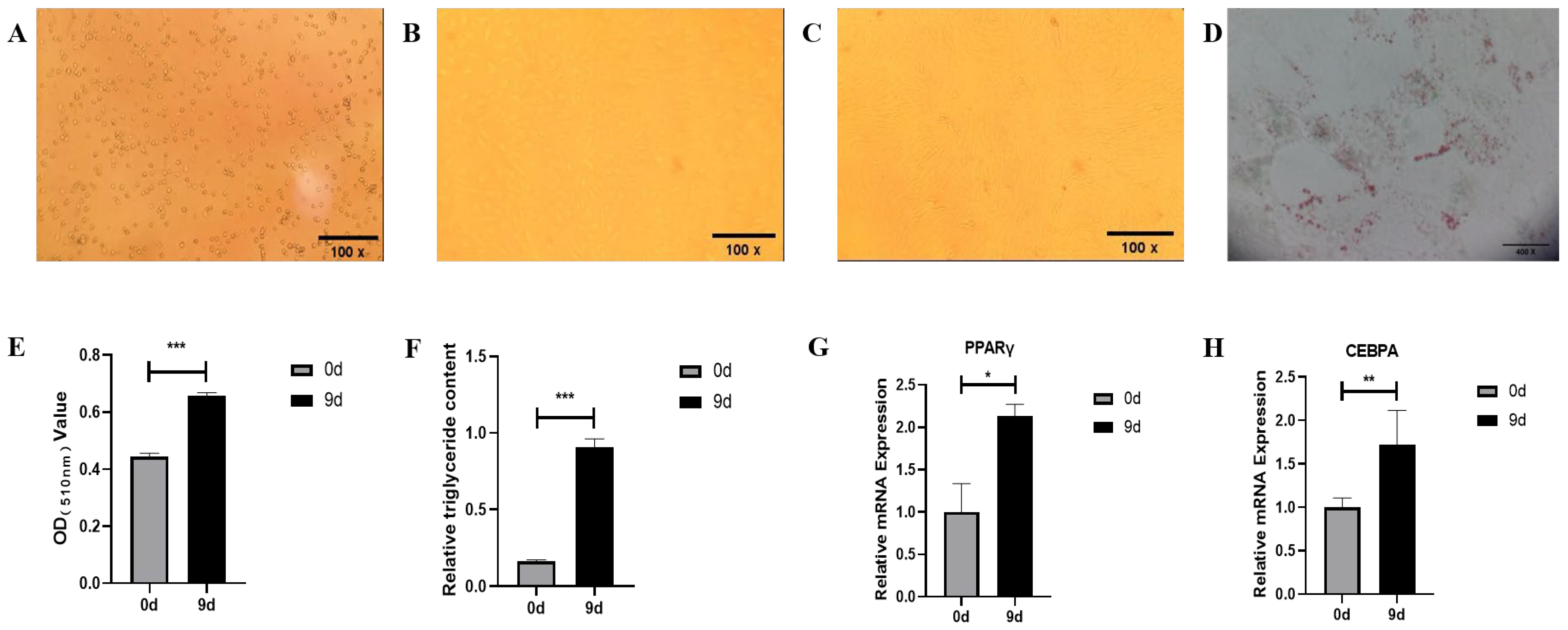 3.1. Morphology, Differentiation, and Identification of Bovine Precursor Adipocytes