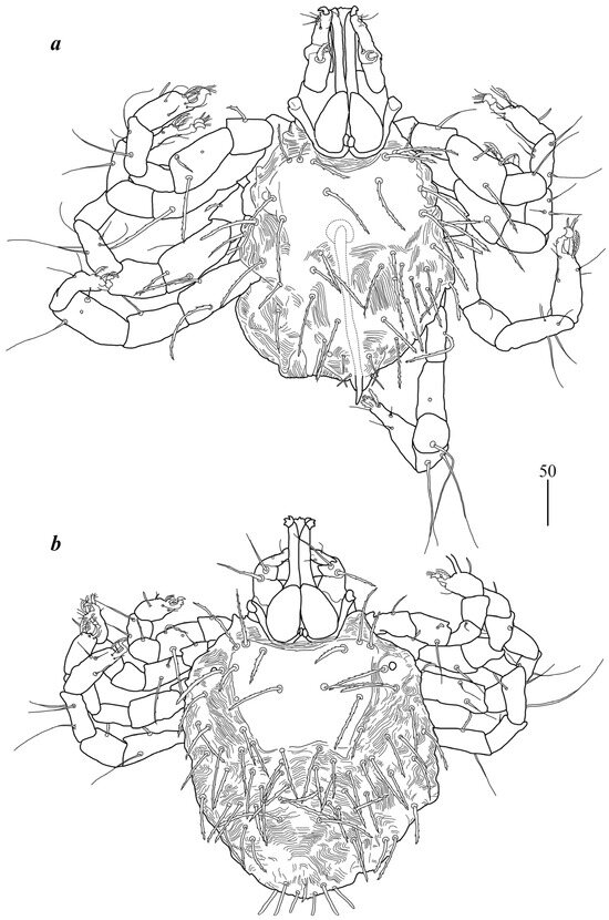 Larva (Figure 4b). Gnathosoma as in female. Chelicerae about 60 long; slender cheliceral part 30 long, swollen part about 30 long. Setae dF filiform and slightly serrate, 25 long; setae dG filiform and smooth, about 35 long. Peritremes about 35 long. Subcapitular setae n absent. Idiosoma 130 long and 155 wide. Dorsum. Propodonotal shield 60 long and 75 wide; well-outlined, bearing four pairs of densely serrate setae: 2 pairs situated antero-laterally (one pair longer, 40 long, one pair shorter, 20 long), and 2 pairs situated posteriorly on the shield, both about 45 long. Laterally to propodonotal shield eye on ocular plate and one seta present (40 long). In posterior half of idiosoma five pairs of posterior setae 40–50 long present. Venter devoid of any setation. Genital area with 3 filiform genital setae g1–g3, 5–10 long, and two slightly serrate pseudanal setae ps1–ps2 15–20 and 20–25 long. Coxae in formula: 2–0–1. Setae 1a, 1b filiform; 3a short, densely serrate. Setation of trochanters-tarsi I–IV as in female, except for presence in several specimens of dGI; setation of legs I–III typical for larva (Figure 5 and Table 2 in [30]).