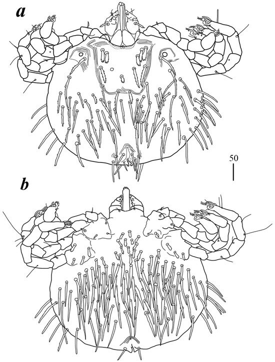 - Grandjean, F. Les segments postlarvaires de l’hystérosoma chez les oribates (Acariens). Bull. Soc. Zool. Fr. 1939, 64, 273–284. [Google Scholar]