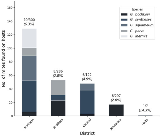 Analysis of mite distribution across Israeli administrative districts (Figure 7) revealed significant geographic heterogeneity in both prevalence and species composition. Among hosts with district assignments, infections were recorded from all five main administrative districts, with the highest prevalence in Northern District (19/300 hosts, 6.3%) followed by Central District (6/122 hosts, 4.9%), Southern District (8/286 hosts, 2.8%), Jerusalem District (6/297 hosts, 2.0%), and Haifa District (1/7 hosts, 14.3%). The small sample size in Haifa District (n = 7) limits interpretation.