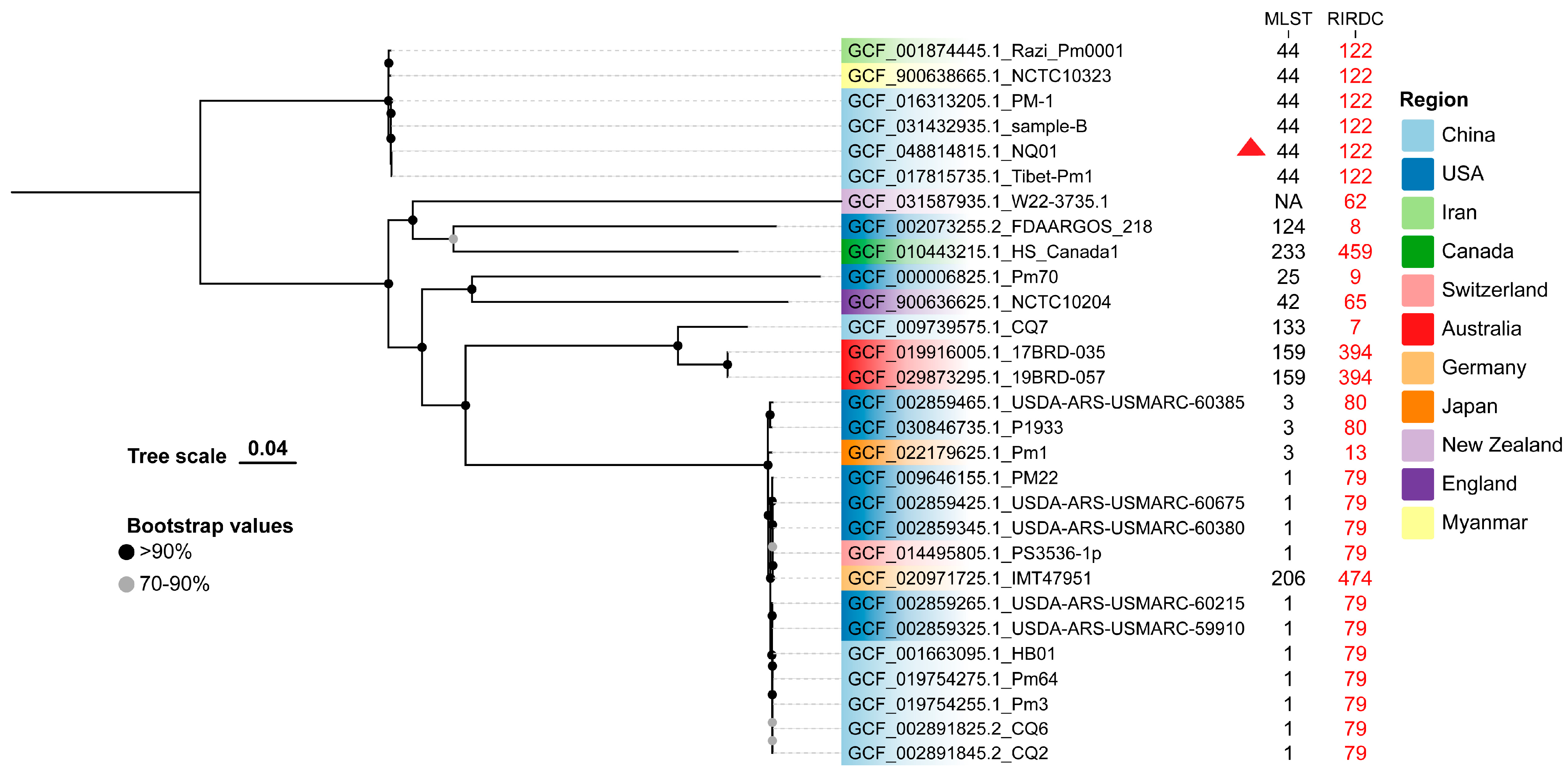 Li, K.; Yuan, H.; Jin, C.; Rahim, M.F.; Luosong, X.; An, T.; Li, J. Characterization and Genomic Analysis of Pasteurella multocida NQ01 Isolated from Yak in China. Animals 2025, 15, 3462. https://doi.org/10.3390/ani15233462