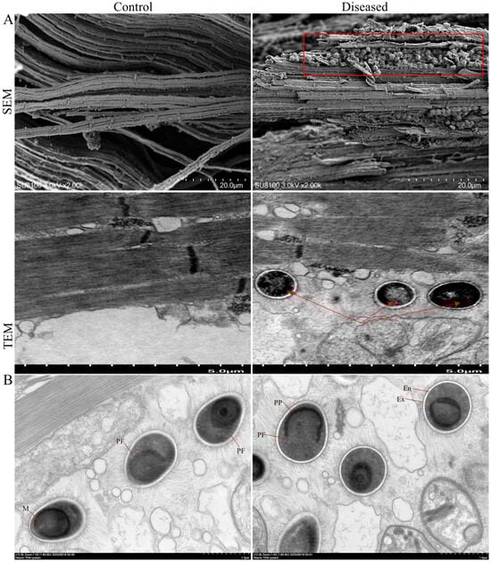 SEM and TEM of control and diseased crab muscle (A). The red frame and arrows indicate spores. Spore structure (B). Ex—exospore; En—endospore; PP—lamellar polaroplast; PF—polar filaments; M—manubrium or straight portion.