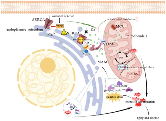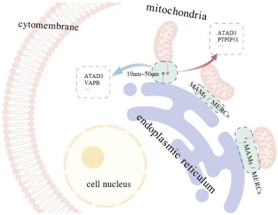 Mitochondria and the ER form specialized contact sites that enable direct communication between the two organelles, known as mitochondria-associated membranes (MAMs) or mitochondria–ER contacts (MERCs) [,]. These structures play a crucial role in regulating calcium homeostasis, lipid homeostasis, cell survival, inflammation, ER stress (ERS) and other essential cellular functions [].