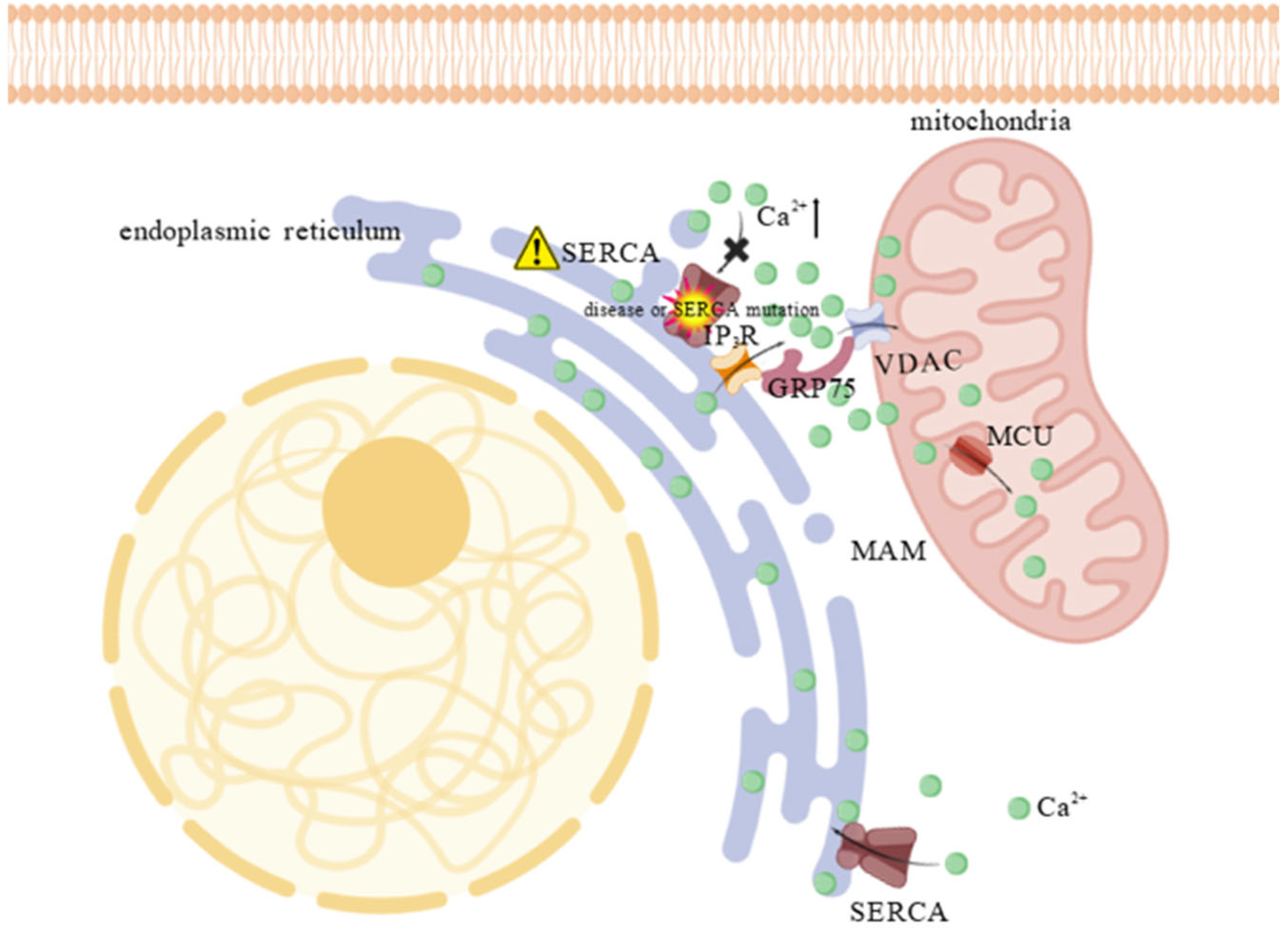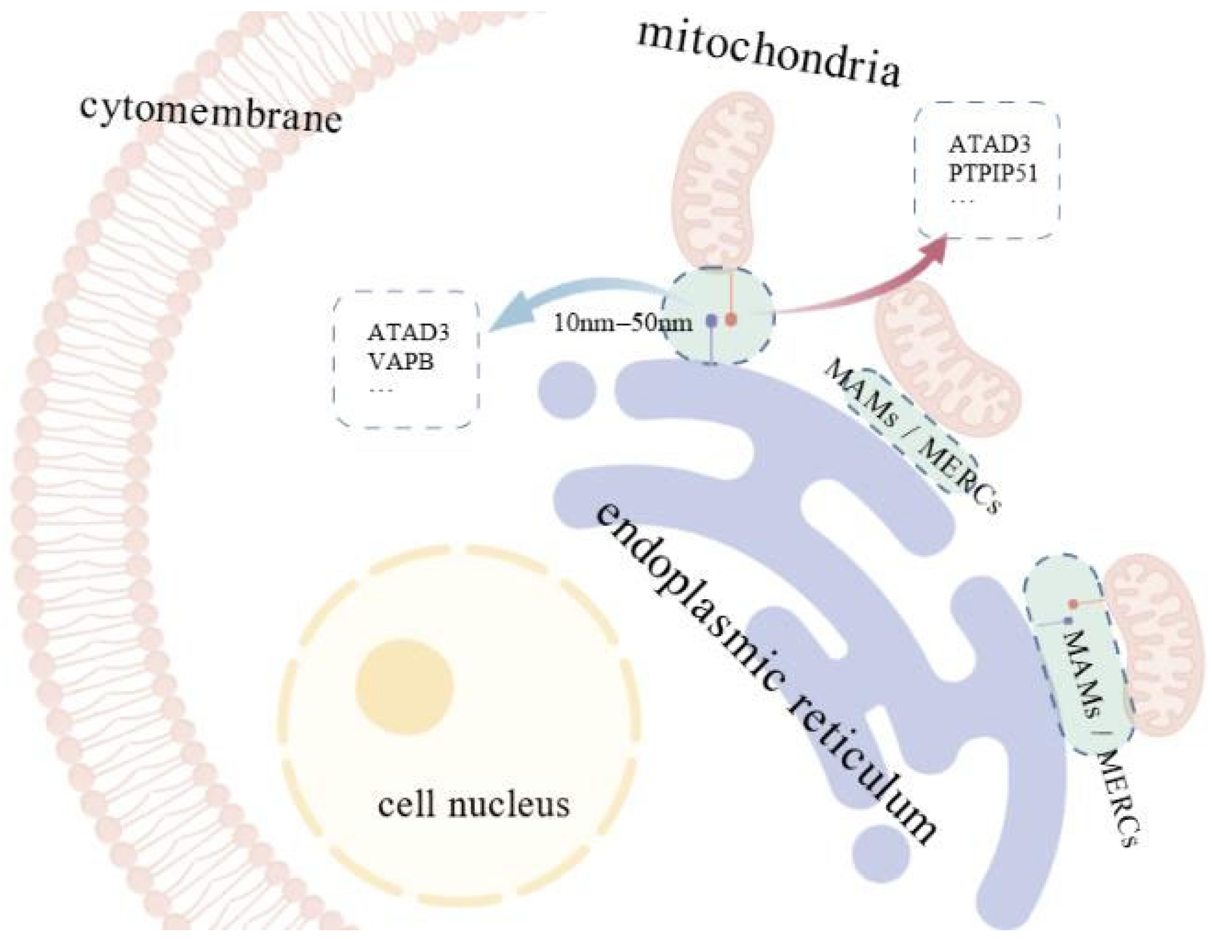- Zhao, W.B.; Sheng, R. The correlation between mitochondria-associated endoplasmic reticulum membranes (MAMs) and Ca2+ transport in the pathogenesis of diseases. Acta Pharmacol. Sin. 2025, 46, 271–291. [Google Scholar] [CrossRef]