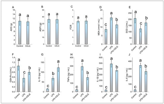 The effects of CELE on weight gain, blood antioxidant parameters, and blood inflammatory cytokines in broiler chickens. “Weight Gain” is defined as the average value of body weight at 42 days (g) minus body weight at 7 days (g) for the broilers in each treatment group. (A) Average daily gain (ADG), (B) Average daily feed intake (ADFI), (C) Average feed conversion ratio (FCR), (D) Serum malondialdehyde (MDA) content, (E) Serum superoxide dismutase (SOD) activity, (F) Serum glutathione peroxidase (GSH-Px) activity, (G) Plasma interleukin-10 (IL-10) level, (H) Plasma tumor necrosis factor-alpha (TNFα) level, (I) Plasma interleukin-1 beta (IL-1β) level, (J) Plasma interleukin-6 (IL-6) level. The same shoulder label letter indicates no significant difference (p > 0.05), different lowercase letters indicate significant difference (p < 0.05).