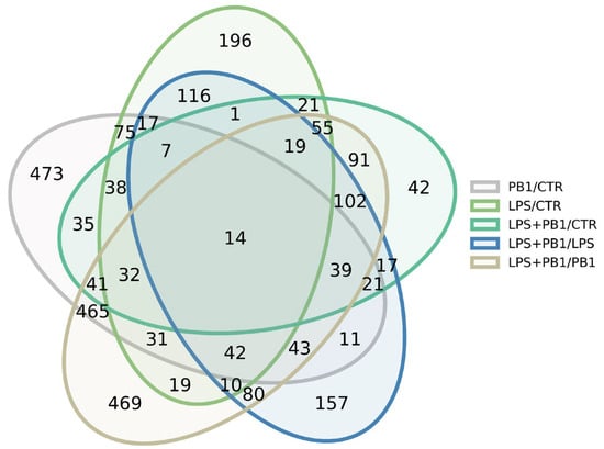 RNA sequencing of PB1- and LPS-treated HD11 cells yielded an average of 3.2 million reads per sample, which were mapped to 12,351 annotated chicken transcripts. Analysis revealed 1068 significantly differentially expressed transcripts (FDR < 0.05) between LPS-treated and control groups. These were predominantly enriched in the Toll-like receptor signaling pathway and bacterial infection-related genes, such as TLR4, JUN, and TNFSF10. A total of 1398 transcripts were significantly differentially expressed (FDR < 0.05) between the PB1-treated and control groups. Among these, inflammation-related genes—such as TSPAN18, BST1, HIF1A, FOXF1, RBPJ, CAMK2N1, and CMKLR1—and antioxidant-related genes—including ABCC9, LOXL3, and SQOR—were notably represented. A total of 1060 transcripts were significantly differentially expressed (FDR < 0.05) between the LPS + PB1 and control groups. These included cytokine-related genes such as CRLF1, TIMP3, ADRA2A, BMP4, KIT, and TNFRSF19. A total of 1110 transcripts were significantly differentially expressed (FDR < 0.05) between the LPS + PB1 and LPS-only groups. These included inflammation-related genes (e.g., KCNJ8, CCN3, AGTR1, F2R, APOD) and antioxidant-related genes (e.g., ABCC9, APOD, SOX9). Furthermore, 1999 transcripts were differentially expressed between the LPS + PB1 and PB1-only groups. Among these, numerous genes involved in T cell activation were identified, including CD74, CBLB, NFKBIZ, CD47, and GNAI1. The Venn diagram in Figure 2 shows the number of differentially expressed genes (DEGs) for each comparison, and the complete gene lists are provided in Supplemental Table S2.