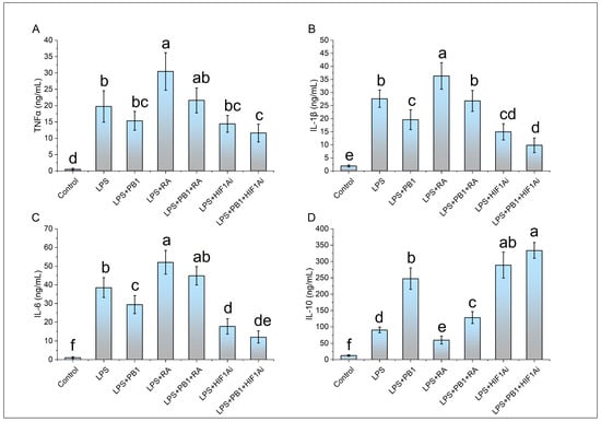 The effects of PB1, RA, and HIF1Ai on inflammatory cytokines in LPS-stimulated HD11 cells. (A) Tumor necrosis factor-alpha (TNFα) level, (B) Interleukin-1 beta (IL-1β) level, (C) Interleukin-6 (IL-6) level, (D) Interleukin-10 (IL-10) level. The same shoulder label letter indicates no significant difference (p > 0.05), different lowercase letters indicate significant difference (p < 0.05).