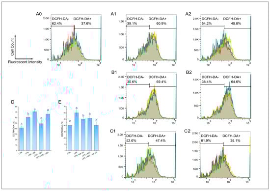 Effect of PB1 on ROS production in LPS-challenged HD11 Cells. (A0–A2,B1,B2,C1,C2) are the representative single-channel flow cytometry histograms. The results are presented as histograms of the relationship between fluorescence intensity (X-axis, DCF) and cell count (Y-axis). The results from the Control group, the LPS-treated Control group, and the LPS + PB1-treated group are displayed in Column (A0–A2). (B,C) present the results of treatment in the presence of RA and in the presence of HIF1Ai, respectively. A vertical gate separates the two populations, with percentages labeled for DCF-DA- and DCF-DA+ subsets. Histograms presented the fluorescence distribution across three replicates (different colors), with shaded areas denoting overlapping populations. (D,E) are bar graphs of ROS levels in HD11 cells from different treatment groups. Bars bearing different letters indicate statistically significant differences (p < 0.05).