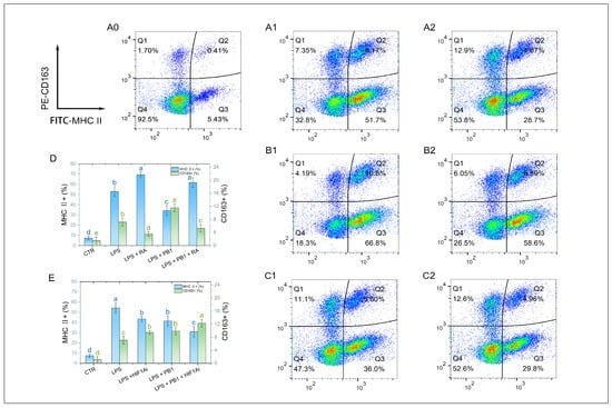 The effects of PB1 on M1/M2 polarization of HD11 cells. (A0–A2,B1,B2,C1,C2) are the representative flow cytometry analyses of the percentage of MHC II+ macrophages and CD163+ macrophages in HD11 cells. The X-axis indicates the fluorescence intensity of MHC II+ cells, while the Y-axis denotes the fluorescence intensity of CD163+ cells. A quadrant gate is employed to subdivide the cell populations into four distinct sections, with Q2 (top right) denoting double-positive cells, Q3 (bottom right) representing M1 cells, Q1 (top left) representing M2 cells, and Q4 (bottom left) classifying unpolarized cells. Columns (A0–A2) present samples from the untreated control group, the LPS-treated group, and the LPS + PB1-treated group, respectively. The rows labeled (B,C) correspond to the presence of RA or HIF1Ai co-treatment, respectively. (D,E) are bar graphs for the percentages of MHC II+ macrophages (blue) and CD163+ macrophages (green) in HD11 cells from different treatment groups. Bars bearing different letters indicate statistically significant differences (p < 0.05).