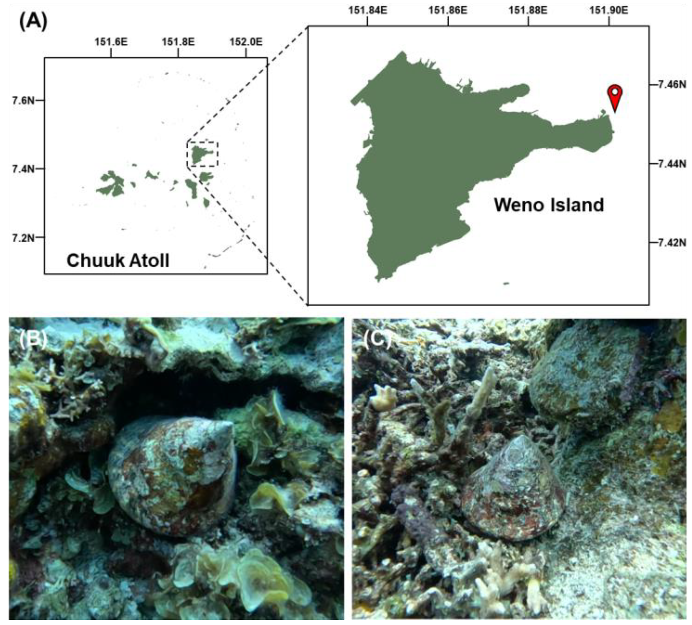 Shin, J.-S.; Park, Y.-J.; Lee, C.; Park, H.-S.; Kim, D.; Song, C.-u.; Kwon, K.; Hur, S.-W.; Min, B.-H.; Kim, J.; et al. Cryptic Divergence of Rochia nilotica (Gastropoda: Tegulidae) from Chuuk Lagoon, Federated States of Micronesia, Revealed by Morphological and Mitochondrial Genome Analyses. Animals 2025, 15, 3471. https://doi.org/10.3390/ani15233471