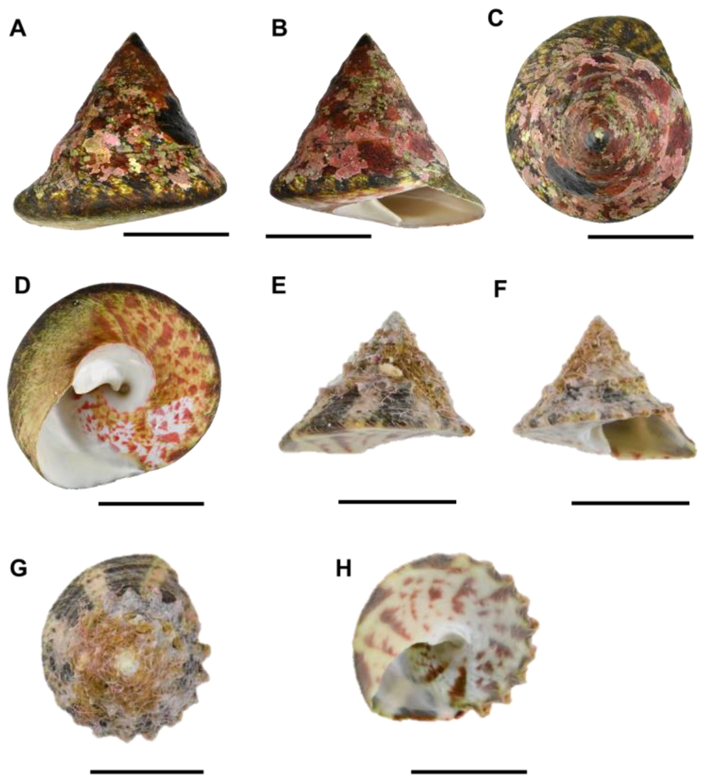 - Dharma, B.; Pringgenies, D. Differences in Shell Morphology of the Species Rochia nilotica (Linnaeus, 1767) and Rochia maxima (F. C. L. Koch, 1844) (Gastropoda: Tegulidae). J. Moluska Indones. 2023, 7, 36–42. [Google Scholar] [CrossRef]