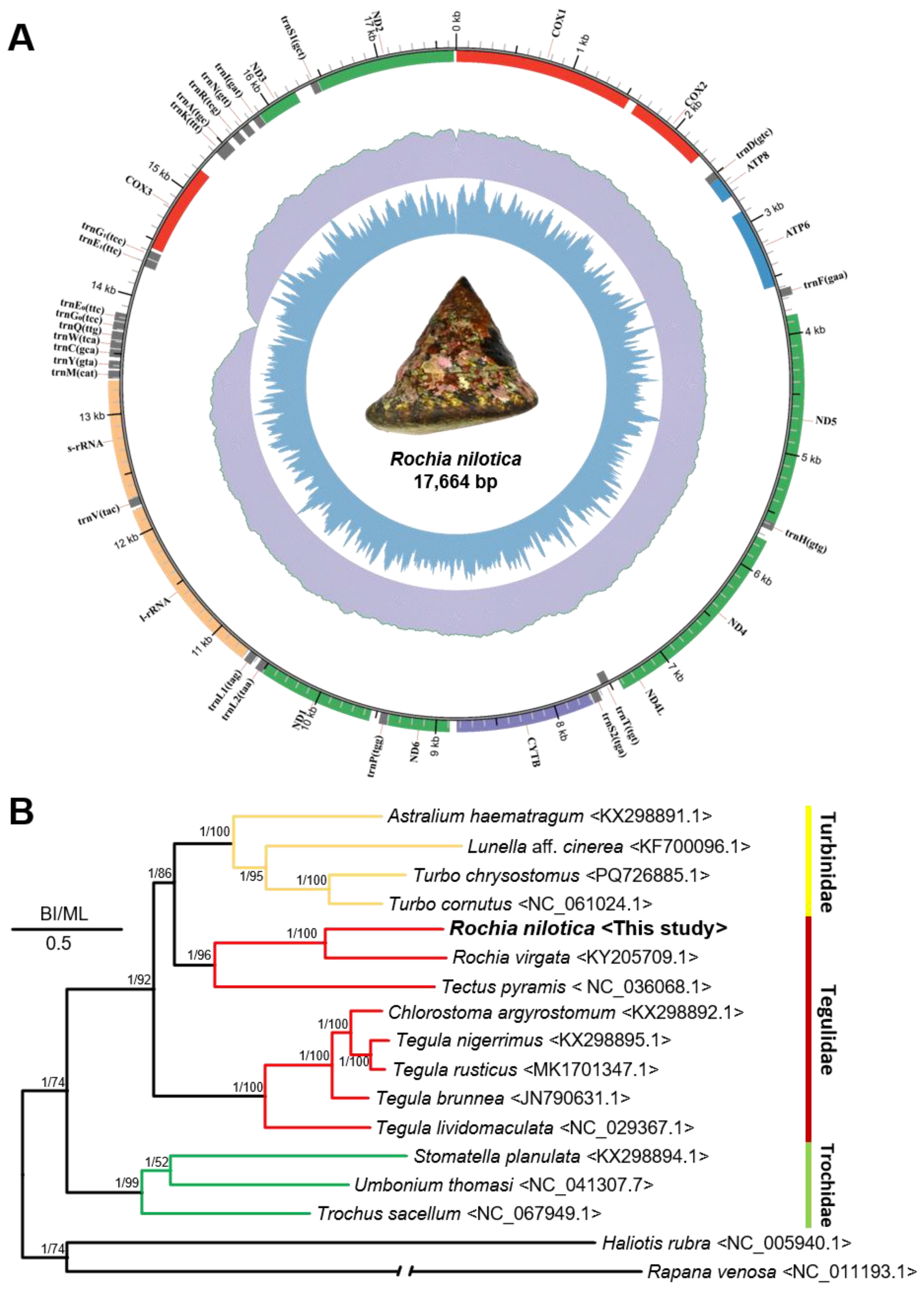 - Jiang, D.; Liu, Z.; Zeng, X.; Tang, X.; Yang, S.; Zheng, X. The Complete Mitochondrial Genome of Rochia nilotica (Gastropoda: Tegulidae). Mitochondrial DNA Part B 2019, 4, 1121–1122. [Google Scholar] [CrossRef]