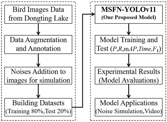The overall technical workflow of the proposed methods is illustrated in Figure 1. This study focuses on ten bird species from Dongting Lake, utilizing images collected from online repositories and field investigations conducted with drones. All images were annotated using LabelImg. During the data preprocessing stage, duplicate images were removed, and data augmentation techniques were applied to enhance the diversity of the dataset. Furthermore, to simulate real-world image degradation, Gaussian noise (with σ values of 0.2, 0.3, and 0.4) and Poisson noise were added to 25% of the images. The cleaned dataset was then divided into training and testing subsets at an 80:20 ratio, resulting in 5402 training samples and 1422 test samples. For bird species identification, YOLO-based object detection models were adopted. Specifically, the YOLOv8 and YOLOv11 architectures were trained and evaluated. The superior model—YOLOv11—was further improved by integrating an MSFN to aggregate multi-scale features and enhance nonlinear representation. The performance of the proposed MSFN-YOLOv11 model was rigorously evaluated using metrics such as precision (P), recall (R), mean Average Precision (mAP), inference time, and F1-score. Experimental results, including noise simulation and video-based applications, demonstrate the effectiveness of the proposed approach.