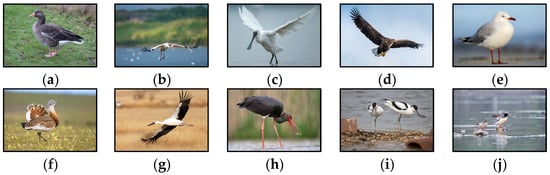 Examples of typical bird species in our collected dataset. (a) Greater White-fronted Goose; (b) White Crane; (c) Black-faced Spoonbill; (d) White-tailed Sea Eagle; (e) Common Black-headed Gull; (f) Great Bustard; (g) Oriental Stork; (h) Black Stork; (i) Pied Avocet; (j) Scaly-sided Merganser.
