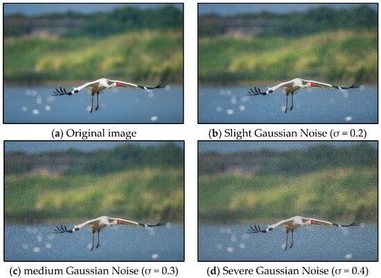 Gaussian noise follows a normal distribution, with its intensity governed by the standard deviation (σ) and mean (μ) parameters, as illustrated in Equation (1). The mean (μ) is set to 0, indicating that the pixel values are not offset. A larger standard deviation (σ) results in greater noise intensity.