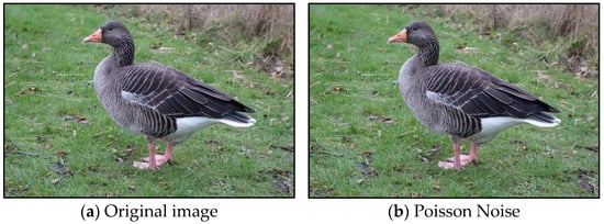 The probability distribution of Poisson noise follows a Poisson distribution, where the variance is equal to the mean. Therefore, in low-light conditions, the variance of the noise increases with the signal intensity; however, the signal-to-noise ratio improves with the square root of the signal intensity. This means that as the signal strength increases, the prominence of the noise also becomes more pronounced. The intensity of the pixel values fundamentally influences the noise. An example of Poisson noise is illustrated in Figure 4.